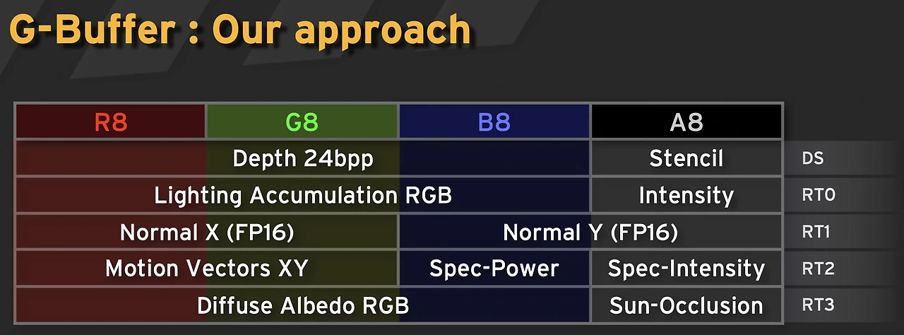 그러나 라이팅 패스에 전달할 데이터의 종류를 원하는 대로 설정하는 것과 마음껏 버퍼에 담는 것은 별개이다. G-Buffer는 우리가 원하는 만큼 사용할 수 없을 뿐더러(지오메트리 패스에서 사용할 수 있는 렌더 타겟의 개수는 하드웨어 및 그래픽스 API 사양에 따라 다르다), 허용된 최대 개수를 사용하는 것 역시 메모리 대역폭의 낭비를 일으키기 때문에 가능한 한 적은 수의 G-Buffer을 이용하는 것이 좋다. 상기한 데이터들을 최대한 담으면서도 G-Buffer의 개수를 줄이기 위해선 G-Buffer가 담을 수 있는 각 픽셀 데이터의 컴포넌트를 최대한 쪼개서 사용하는 것이 일반적이다.