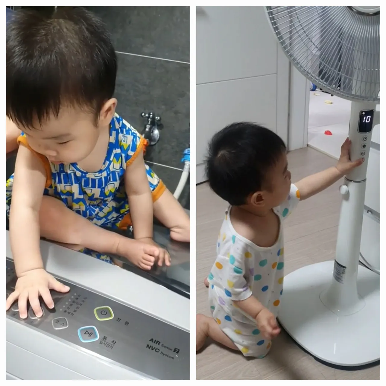 가만보면 이 놈들은 소리 뿐만 아니라 존재 자체로 '노키즈존'을 외친다. 선풍기는 아이들이 손을 넣을 것 같아서 안되고, 히터는 뜨거워서 가까이 할 수 없고, 밥솥은 뜨거운 증기를 내뿜기에 가까이 할 수 없다. 그런데 참 성가신게 아이들은 이 놈들을 무지 좋아한다. 마치 사운드 북을 누르는 것마냥 써큘레이터 버튼을 띡띡 눌러대고, 선풍기 대가리를 이리저리 돌려대며 낄낄댄다. 전자렌지 안에 음식이 돌아가는 광경을 입을 '헤-'벌리고 하염없이 바라보는가 하면, 세탁기 탈수가 돌아갈 때 민준이는 구경하고 싶다고 안아달라고 한다. 건조기가 다 돌아갔음을 알리는 멜로디가 나오면 또 수호는 '어!어!'거리며 나보고 빨리 빨랫감을 빼란다. 집에 들어올 때면 두 아이들은 경쟁하듯 도어락을 이리저리 눌러댄다. 그러다 아예 도어락 잠금이 걸려서 한동안 못들어간 적도 있었다. 이 놈들의 자매품 리모컨은 더더욱 인기만점이다.