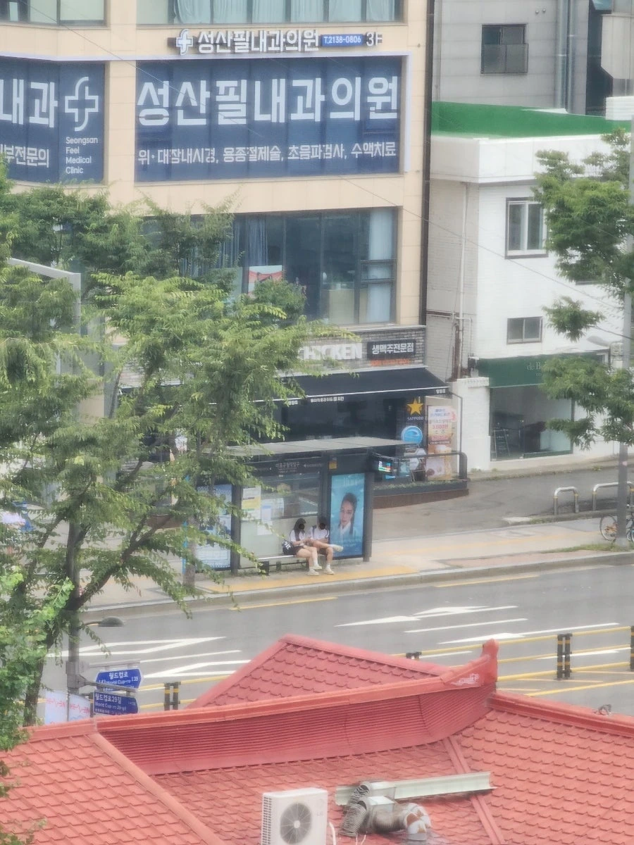 두 학생을 바라보는 여인