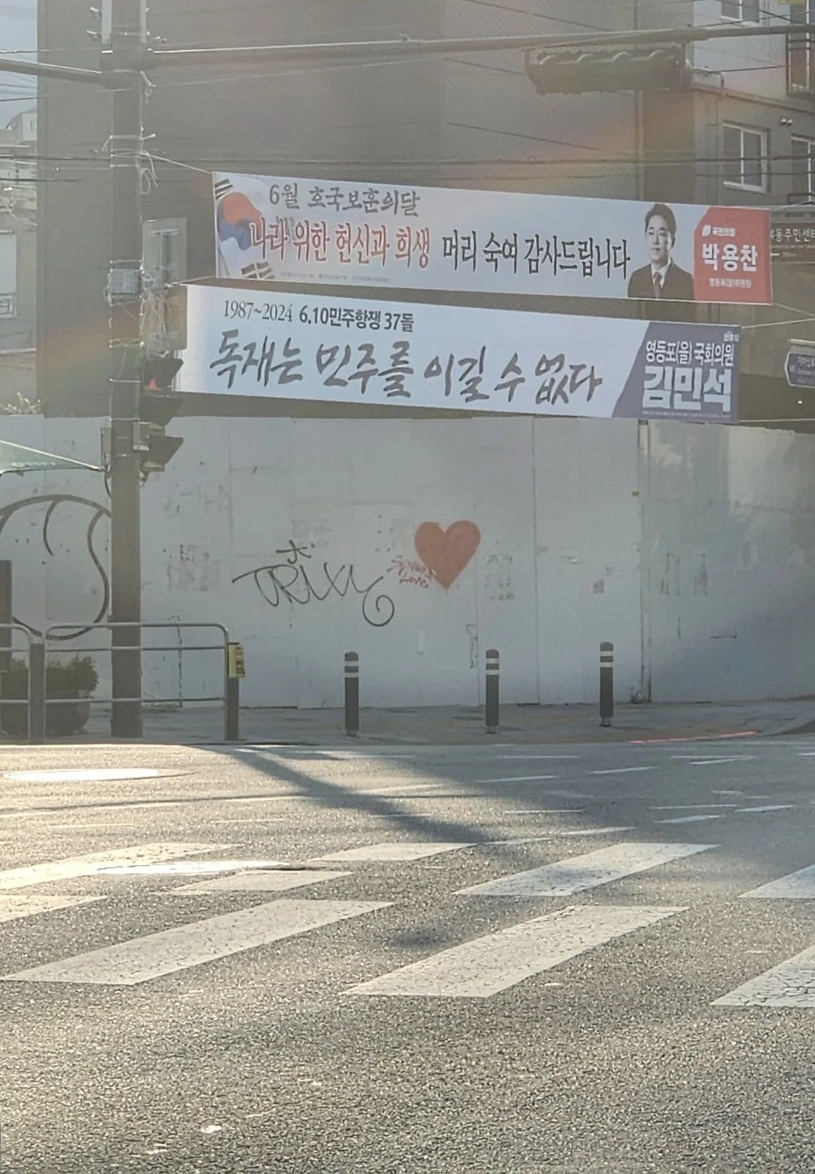 둘이 싸우지 말라고 누군가 벽에 낙서를 했다