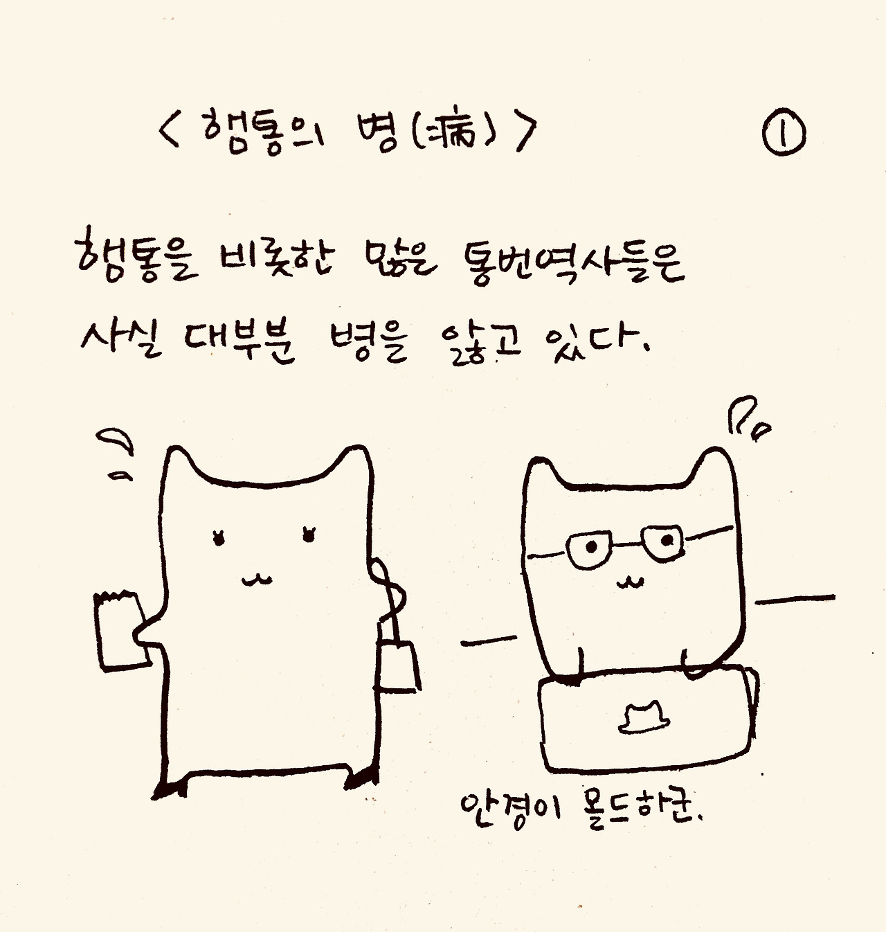 저는 햄스터 통역사입니다. 햄스터 말을 통역하는 건 아니고, 한국어와 중국어를 통역해요. 그럼에도 제가 햄통인 이유는, (이건 비밀인데) 제가 햄스터이기 때문이에요.