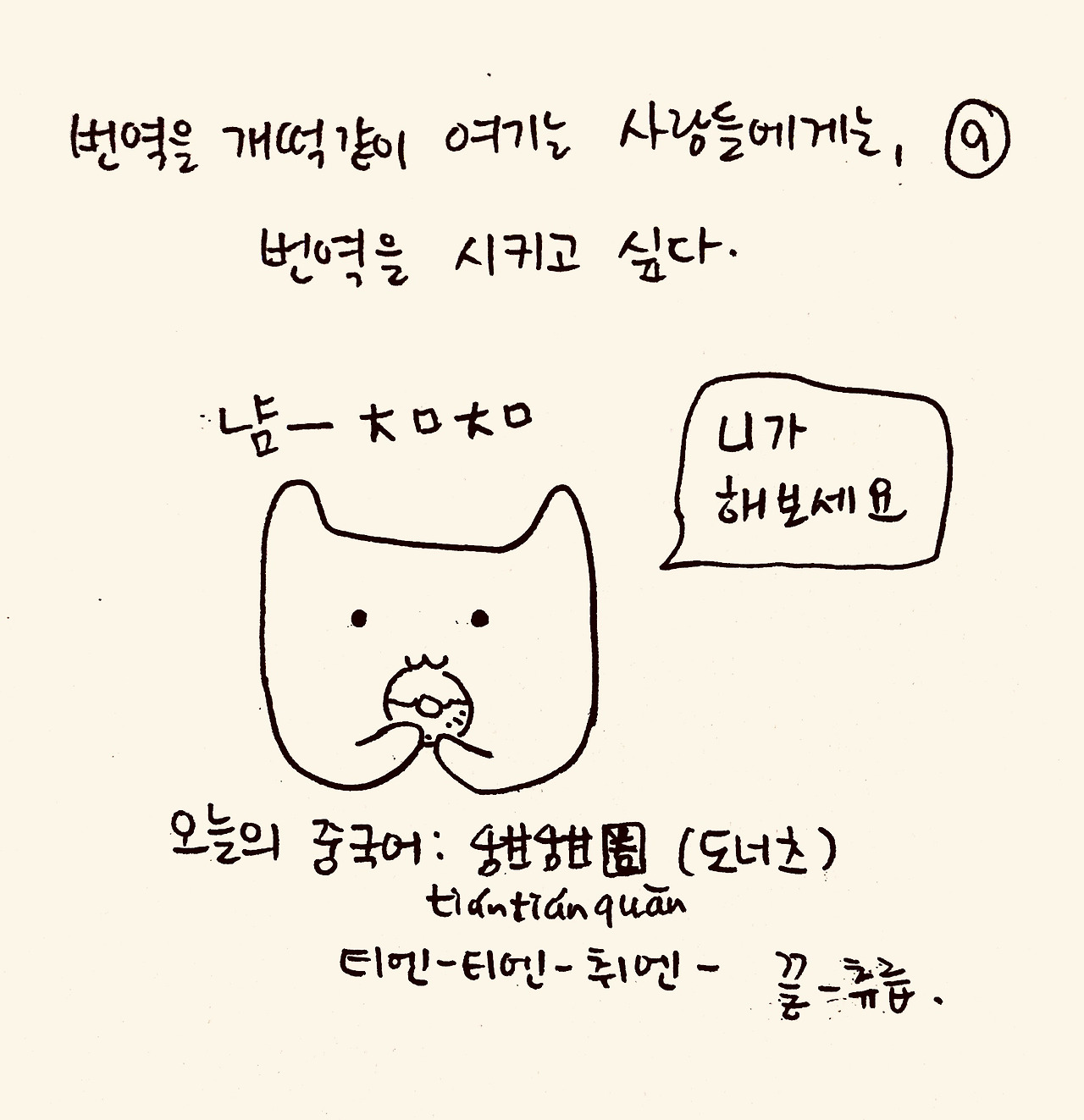 저는 햄스터 통역사입니다. 햄스터 말을 통역하는 건 아니고, 한국어와 중국어를 통역해요. 그럼에도 제가 햄통인 이유는, (이건 비밀인데) 제가 햄스터이기 때문이에요.