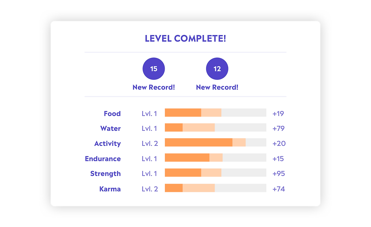 유저가 받는 이 능력치나 포인트들은 유저의 가상 "아바타"를 강화시킬 수 있다. 예를 들어, 유저가 프로그램을 진행함에 따라 아바타의 살이 빠질 수 있다. 첫날에는 아바타가 살짝 살이 쪘지만 프로그램 하루하루마다 더 날씬해지는 것이다. 반대로 너무 많은 날을 빼먹을 때는 체중이 늘어난다. 이게 왜 유효할까? 왜냐하면 유저가 행위에 대한 즉각적인 피드백을 볼 수 있기 때문이다. 이는 유저의 추가적인 동기를 부여하고 유저가 정진하도록 격려할 것이다.