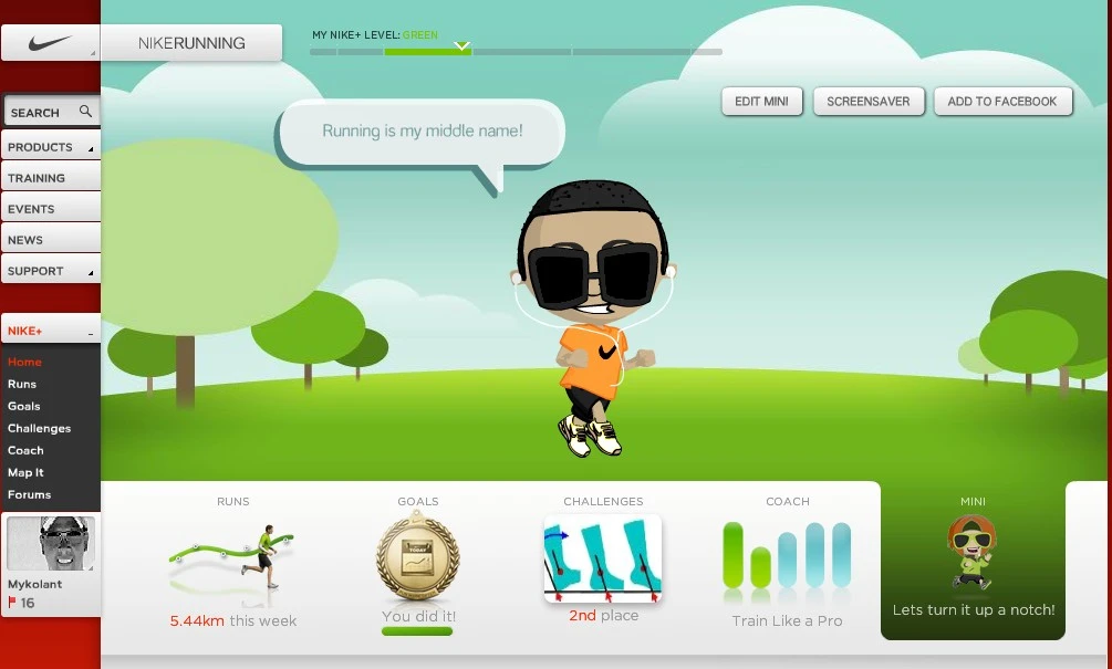 클럽에 가입할 때는 자신의 활동에 따라 성장하는 아바타를 만들게 된다. 이건 커뮤니티와 함께 가장 필수적인 게이미피케이션의 측면 중 하나다. 달린 km와 시간, 포인트 모두 개인 프로필 혹은 Nike+ Mini(Nike+ 상의 아바타, 현재 버전에는 아바타가 없다. : 역주)에 집계된다. 결국 이것들이, 아바타가 어떤 식으로 보이고 유저에게 말을 거는지에 반영되는 것이다.