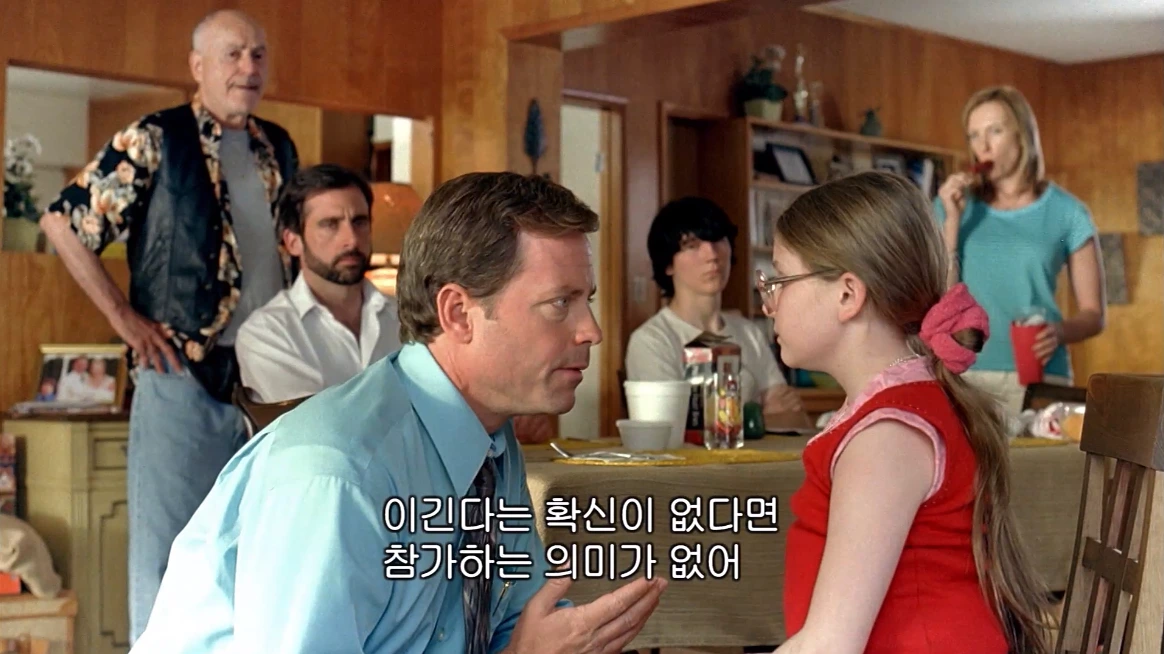 올리브가 다시 양팔을 머리 뒤로 깍지 끼고 배를 튕기며 무대 중앙으로 걸어 나오자, 운영자는 리차드를 등 떠밀며 무대를 멈추게 하라고 경고한다. 리차드는, 열성으로 개구리처럼 온몸을 움직이는 올리브 주변을 서성이며 난처한 듯 귓불을 만지작거린다. 그러더니 귀를 붙잡은 채로 고개를 앞뒤로 움직이기 시작한다. 점점 더 빠르게 고개를 까딱거리고 얼마 안 가 몸통을 흔들고 마침내는 올리브와 똑같은 몸짓으로 춤춘다. 경악한 운영진의 입이 다물어지기도 전에 나머지 가족들이 전부 무대 위로 뛰쳐오른다. 올리브의 삼촌과 오빠, 엄마까지 다 같이 무대 위에서 한 팀의 개구리가 된다.