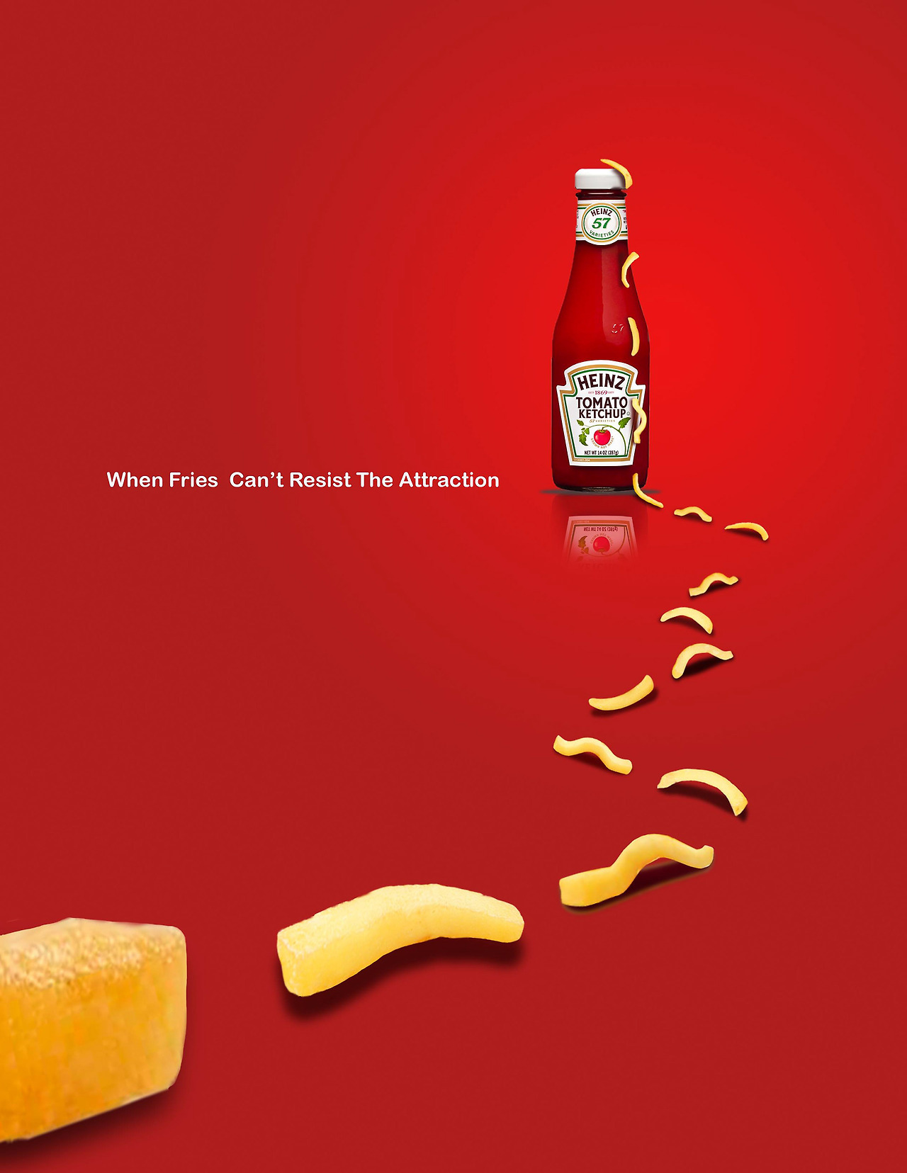 "감자튀김과 완벽하게 잘 어울리는 맛"이라는 장점은 "감자튀김이 유혹을 이기지 못할 때"라는 아이디어로 재탄생했어요.