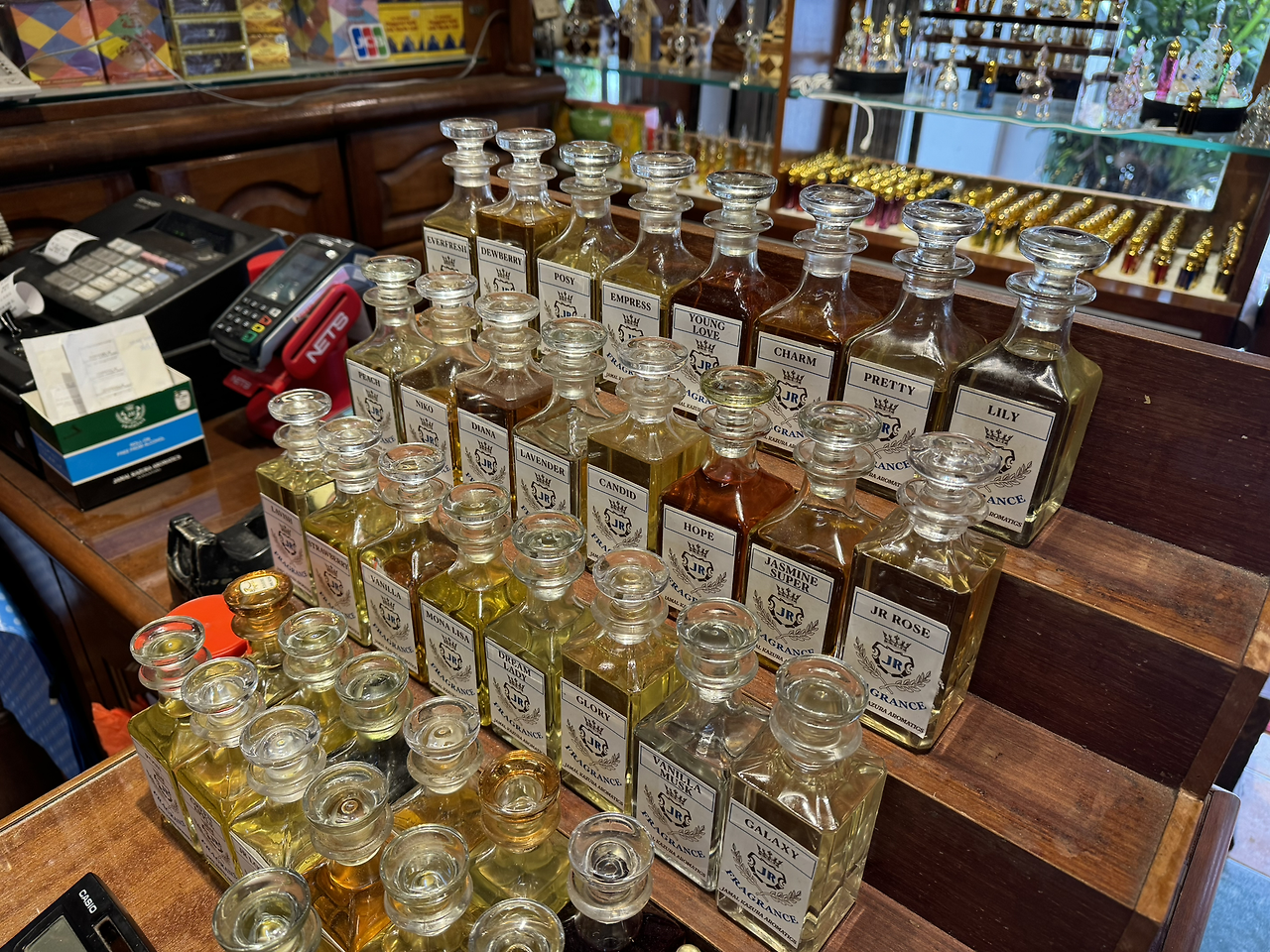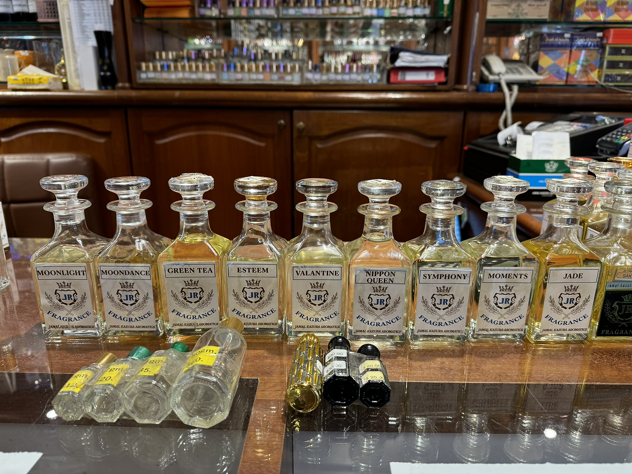 가게에 들어서면, 손님을 맞이하는 건 기분 좋은 향의 조화예요. 공기 중에는 은은하게 스며든 나무 향과 함께 약간의 향신료 냄새가 섞여 있고, 화려한 디자인의 향수병들에서는 달콤하고 상큼하며 흙 내음이 나는 향들이 흘러나와요. 이곳에서 베스트셀러 1위는 Nippon Queen, 2위는 Green Tea, 그리고 3위는 Moments라고 해요.