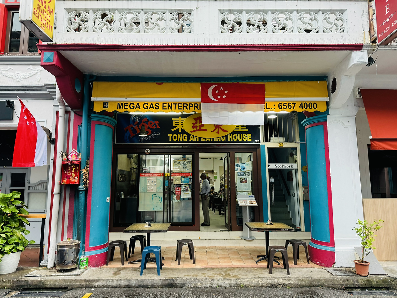 원래의 건물은 현재의 가게와 멀지 않은 곳에 자리하고 있어요. 1939년부터 약 75년 동안 Tong Ah Eating House는 Keong Saik Road에서 독특한 빨간색과 흰색 외관, 삼각형 모양의 대지 위에 자리해 왔습니다. 2013년에 현재 위치로 몇 집 건너로 이전하게 되었지요.