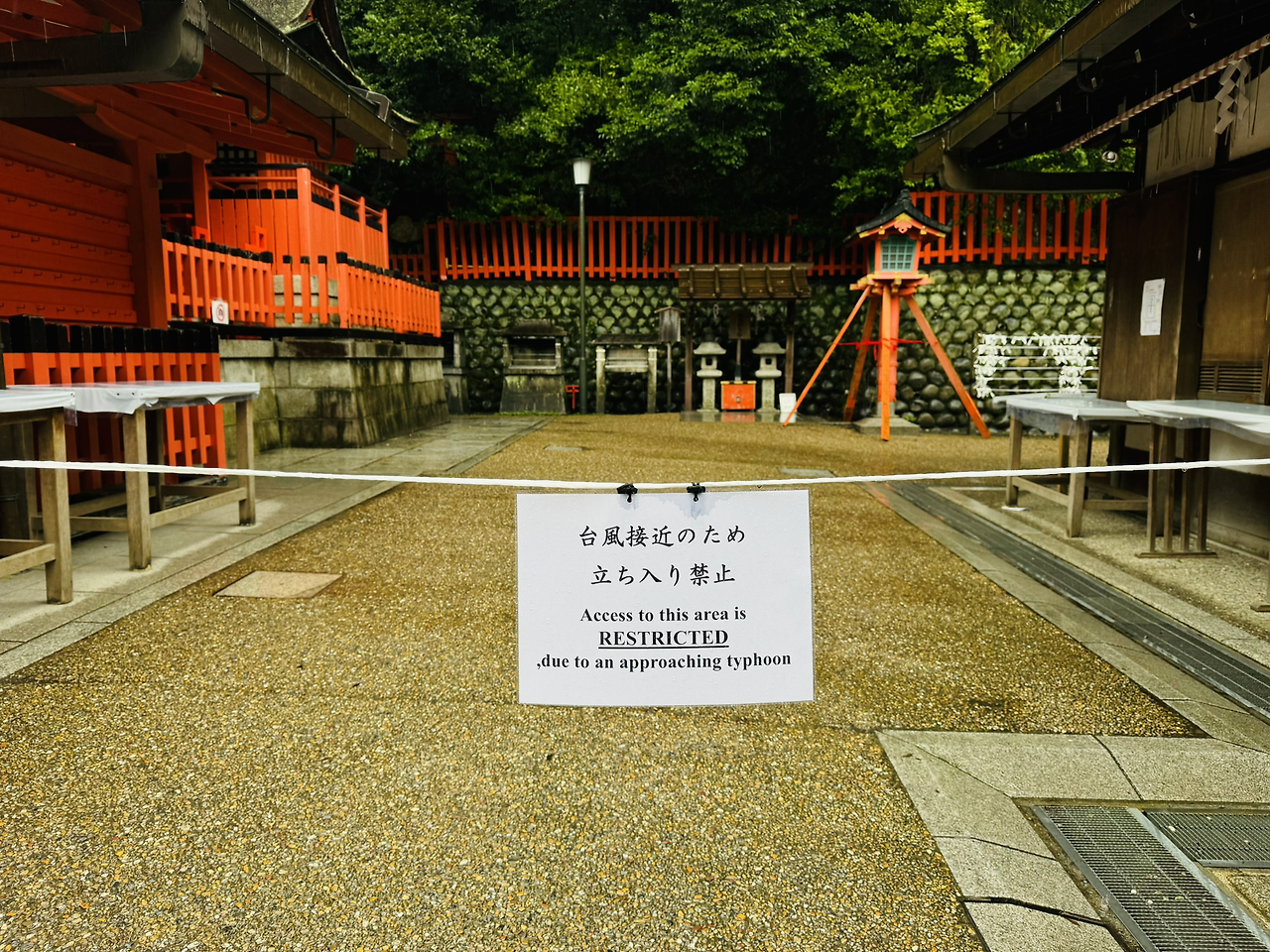 2. 이 날은 태풍 산산이 일본 열도에 상륙한 날이었어요. 태풍이 오사카와 교토 쪽으로 접근하면서 아침부터 비가 내리기 시작했고, 많은 관광지와 가게들은 태풍에 대비하며 문을 열지 않았습니다.