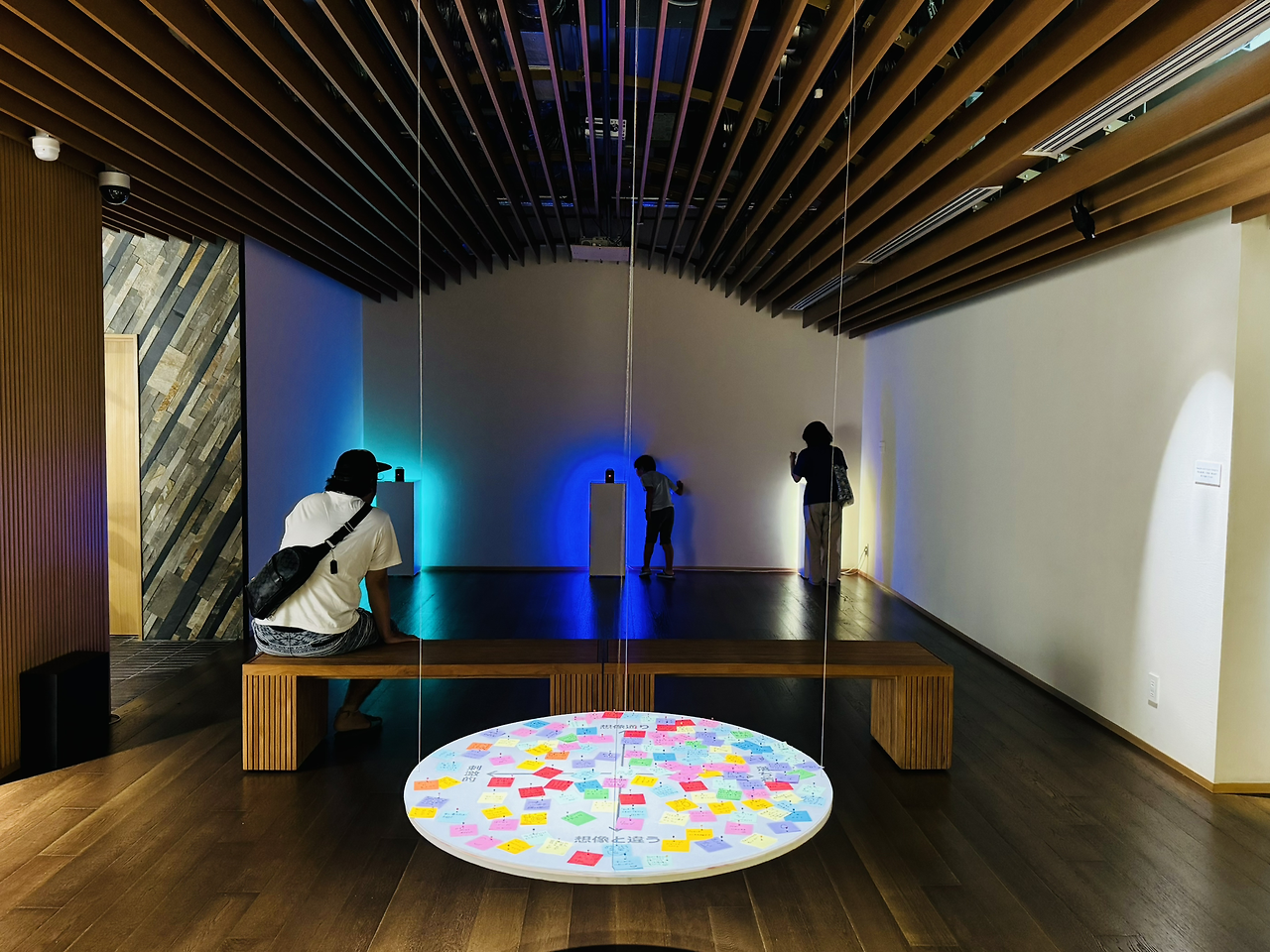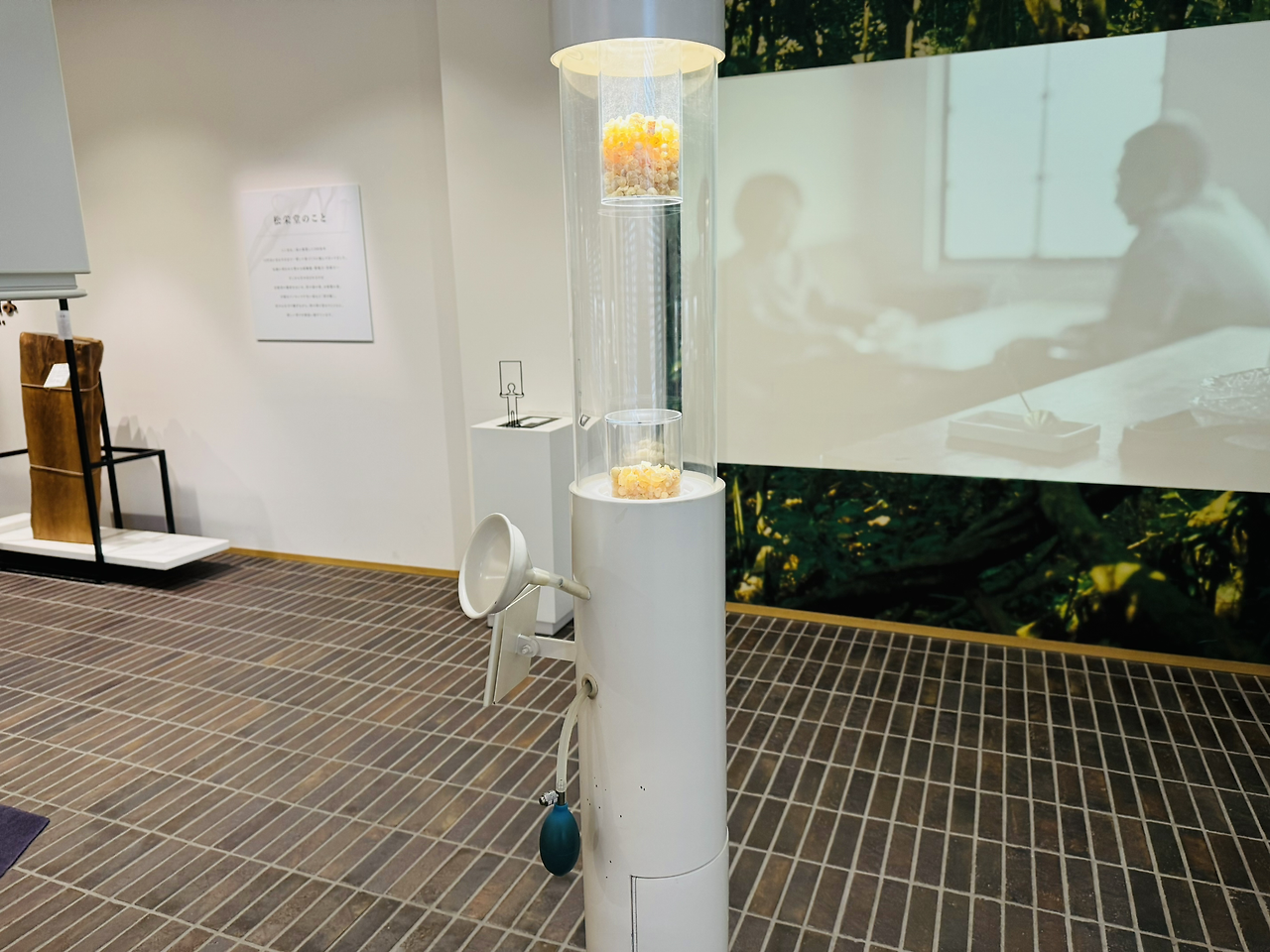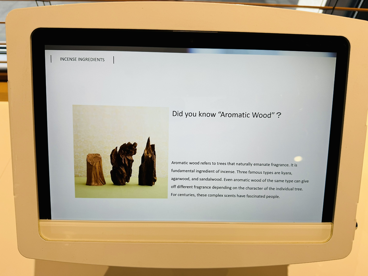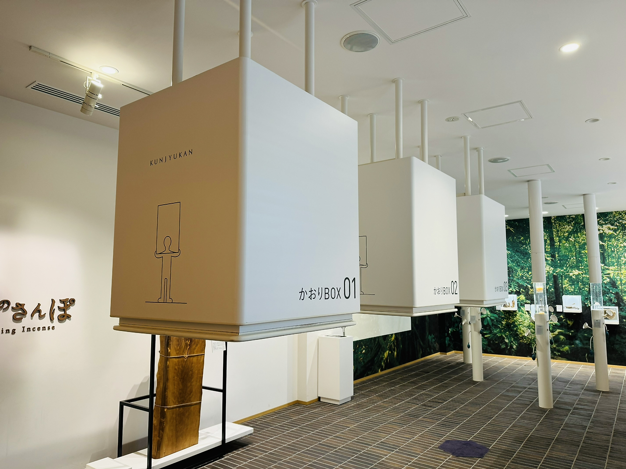 쿤주칸에 들어가면 천장에 매달린 박스가 먼저 눈에 띄는데요. 카오리 박스예요. 카오리는 일본어로 좋은 향기를 뜻해요. 카오리 박스에 들어가면 나만의 공간에서 쇼에이도 인센스의 향을 '들어볼' 수 있어요.