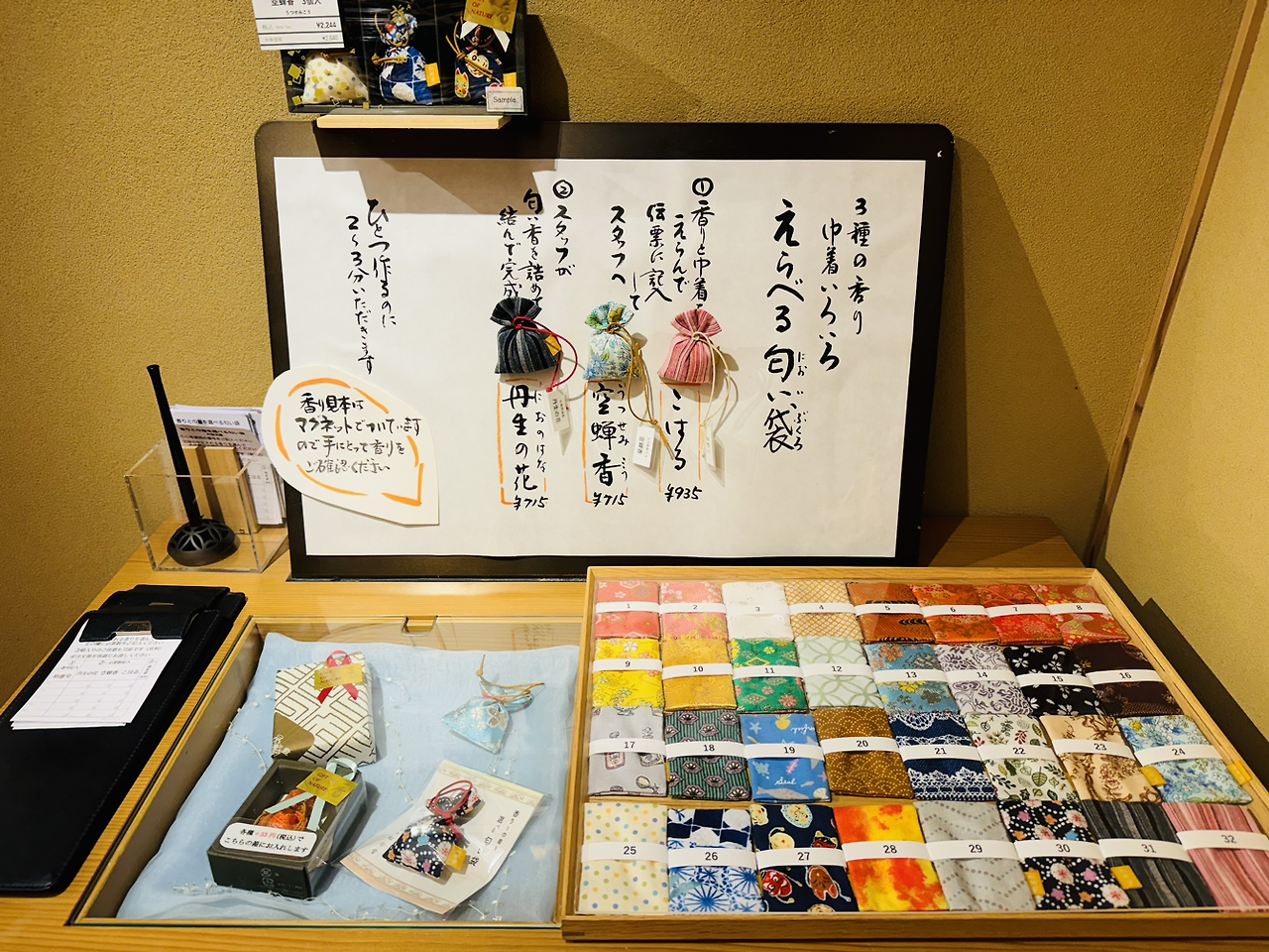 향을 피우는 것에 익숙하지 않은 사람들을 위해서는 사쉐 제품도 판매하고 있었습니다. 향과 다양한 포장지를 선택할 수 있어요.
