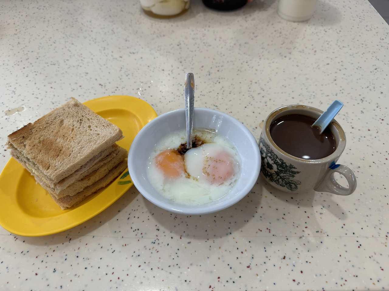 아침에 카야토스트와 살짝 익힌 달걀, 커피세트로 하루를 시작하는 사람들이 많아요.