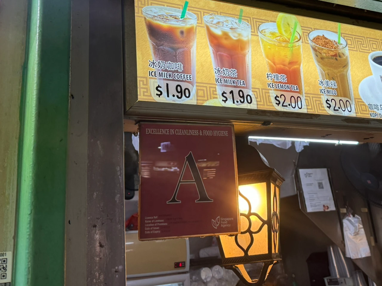싱가포르 정부는 배수로와 음식물 처리를 철저하게 관리하고, 각각 상점의 청결도를 평가하여 A부터 D등급으로 나눕니다. 아래 사진에 빨간색 A, 연두색 B가 보이시나요? A등급이 최상 등급으로 매우 우수, B등급이 우수 등급입니다.
