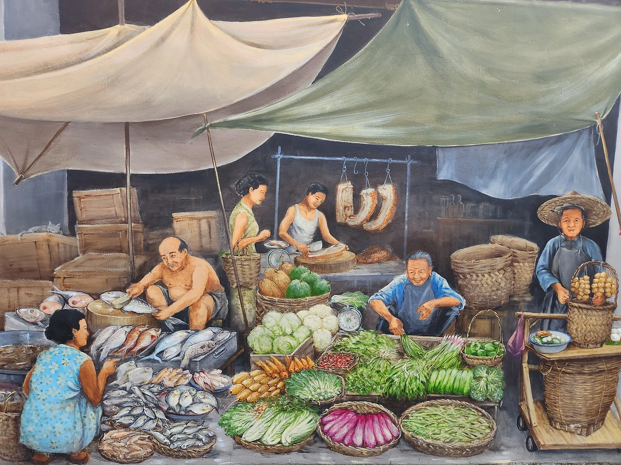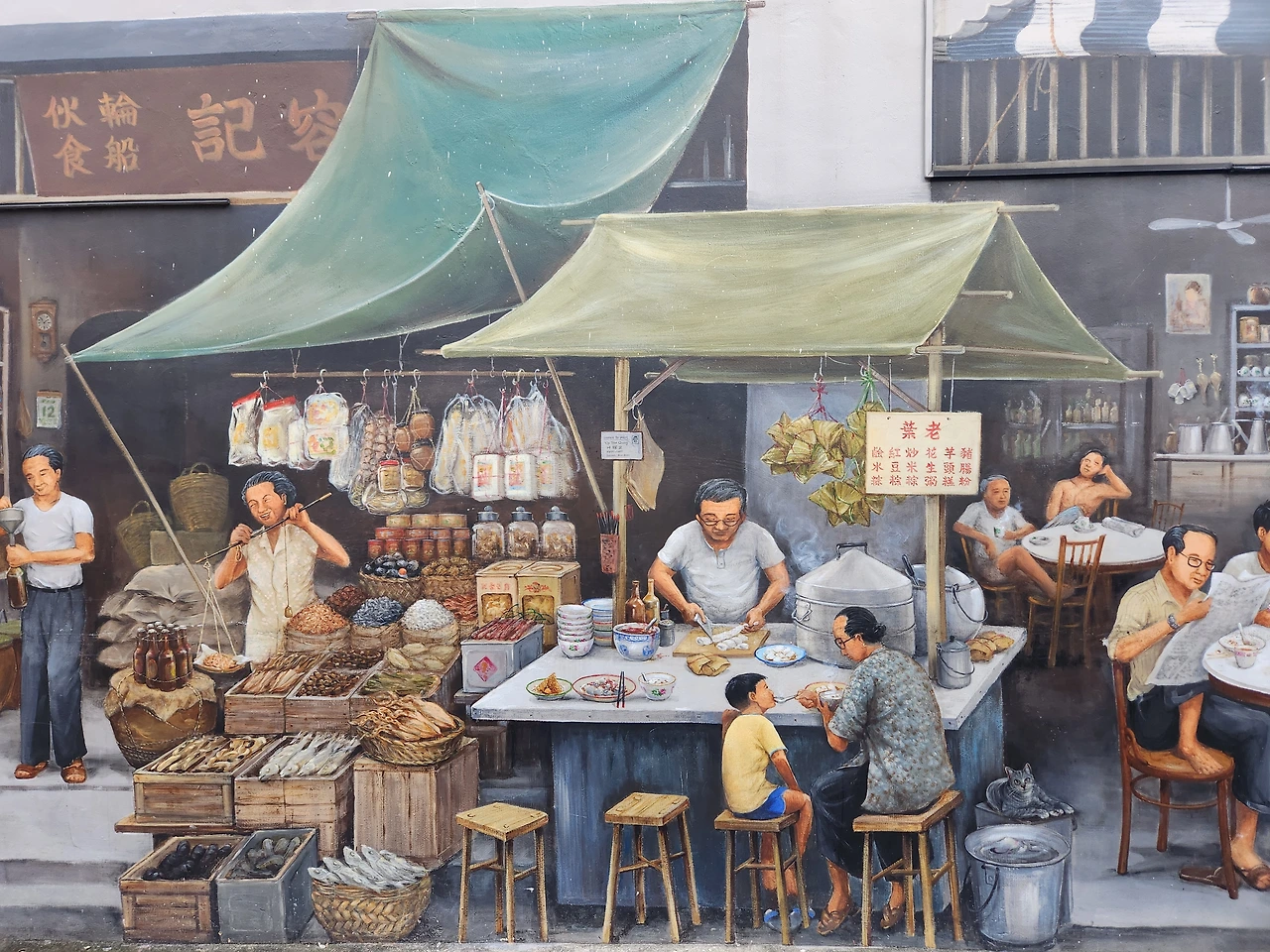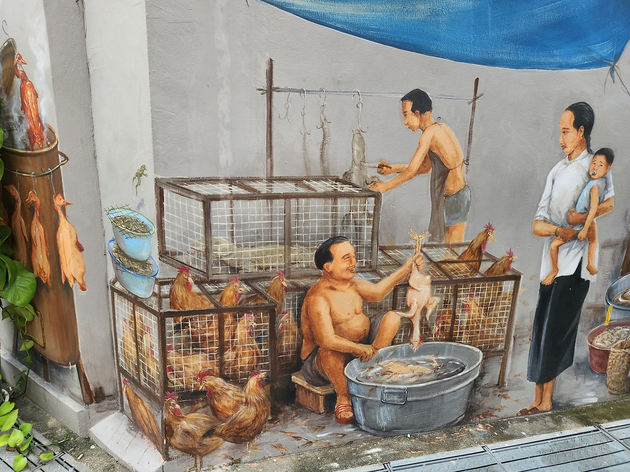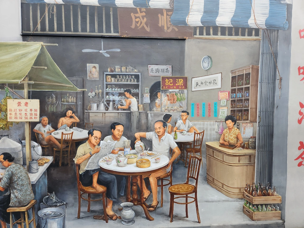 이 벽화를 그린 사람은 Yip Yew Chong이라는 유명한 로컬 아티스트인데요. 그는 40대까지 회계사로 일하다가 금융계를 떠나 그림을 그리기 시작했어요. 그의 작품은 섬세하게 디테일이 살아있고, 그의 어린 시절 추억, 지나간 세대나 잊혀진 장소에 대한 이야기를 담고 있습니다.