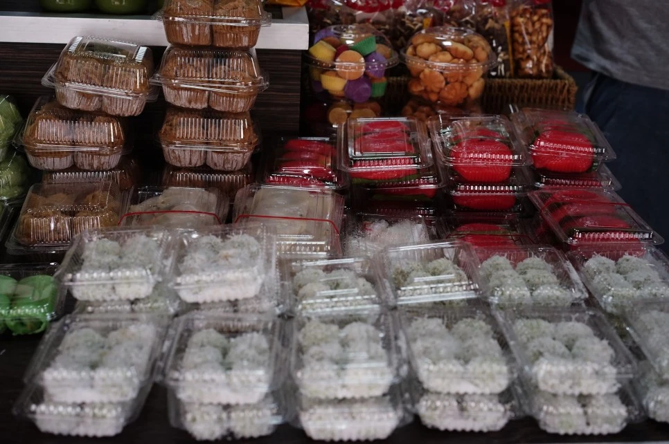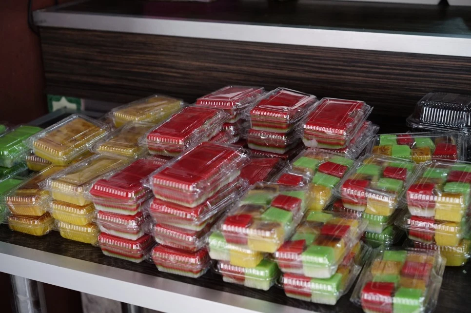 가게 앞 쪽에 자리를 하고 있는 빨강, 노랑, 초록 알록달록한 디저트의 이름은 논야 꾸에로 페라나칸 전통 디저트예요. 쫀득쫀득한 식감이 떡과 비슷한 달달한 간식입니다.
