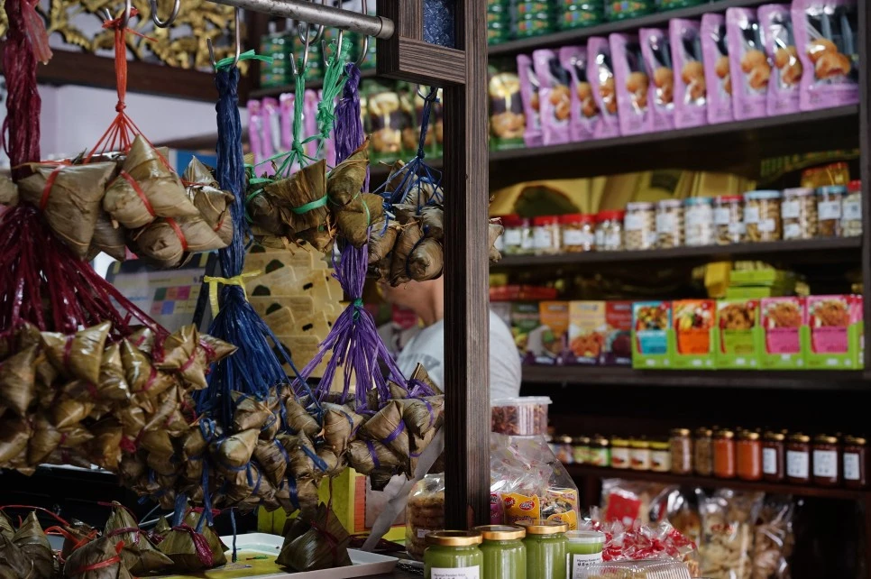 킴츄쿠에창은 1945년부터 지금까지 페라나칸 전통 요리와 향신료를 팔고 있는 곳이에요. 현재는 페라나칸 전통 의복과 신발, 다양한 액세서리도 함께 판매하고 있습니다.