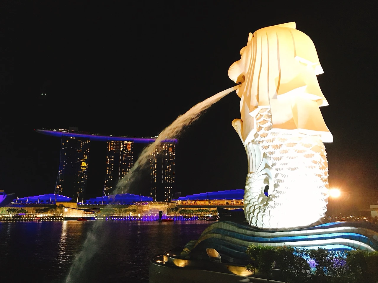사자의 머리는 사자의 도시 싱가포르를 상징합니다. 스리비자야 왕자가 싱가포르에 상륙했고, 사자의 형상을 한 신기한 동물을 발견하고 이곳을 싱가푸라, 즉 사자의 도시라고 이름 붙였거든요. 물고기의 꼬리는 예로부터 싱가포르의 주요 산업이었던 해운업을 상징한대요. 멀라이언이 물을 뿜는 이유는 풍수지리 상 물이 풍요와 부를 가져다준다는 생각 때문이라고 합니다.