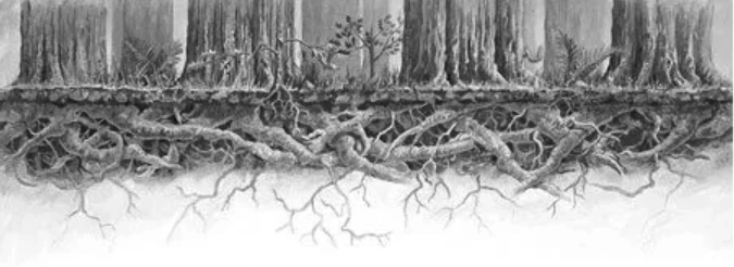 레드우드의 전략은 뿌리를 깊이 내리는 대신 옆으로 퍼뜨려서 다른 나무들의 뿌리와 얽히게 하는 것이었습니다.
