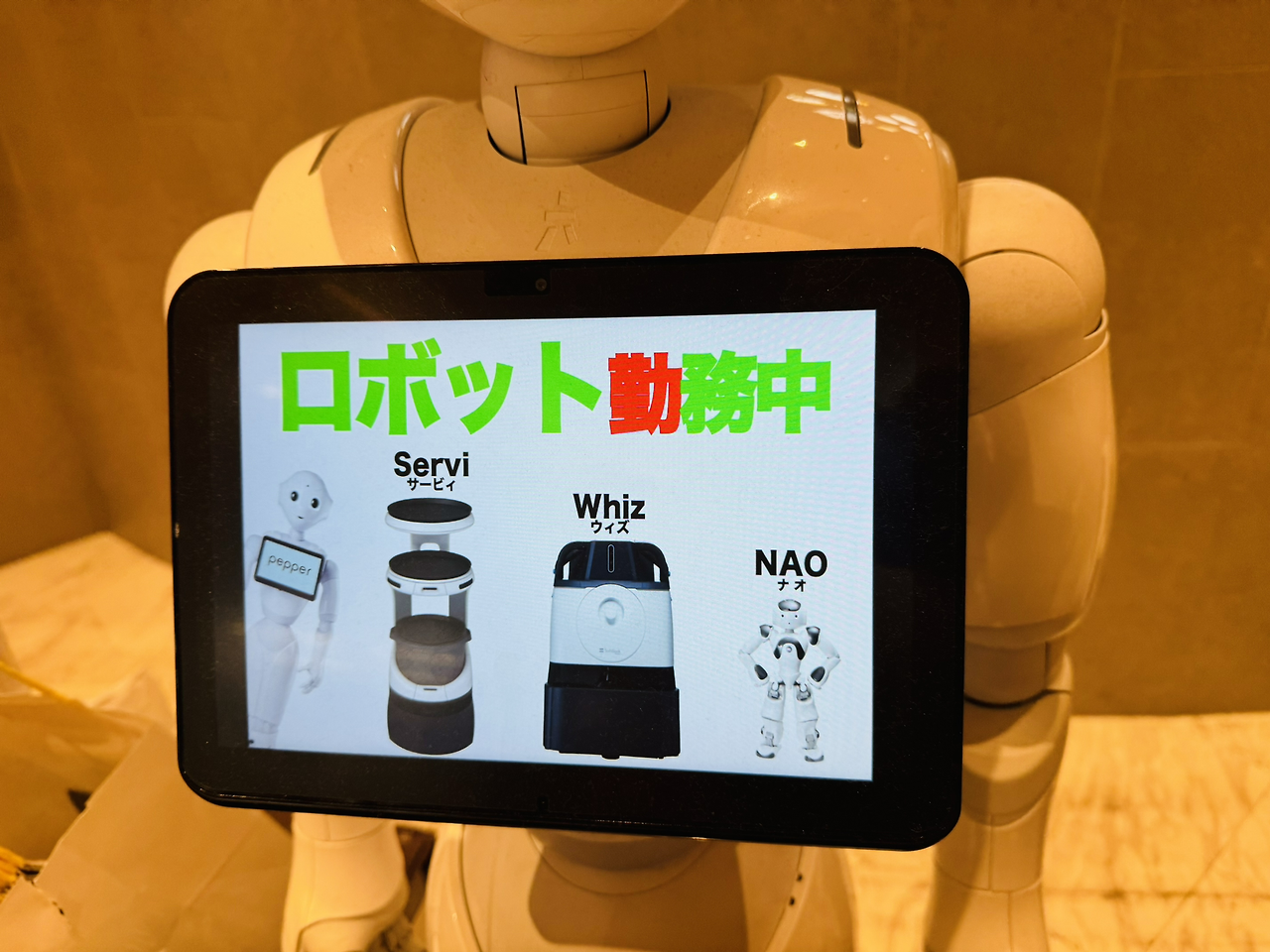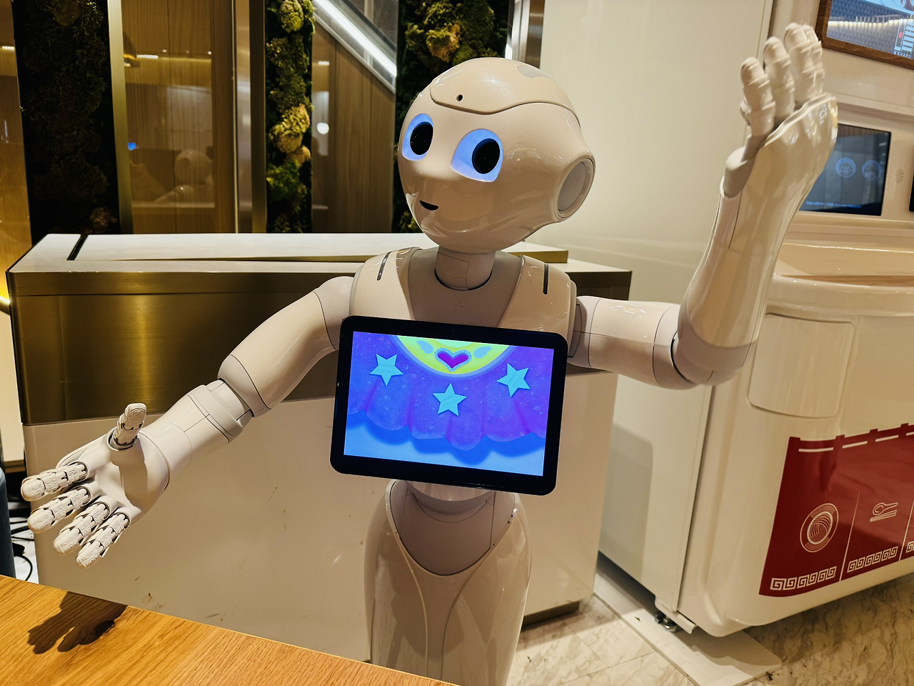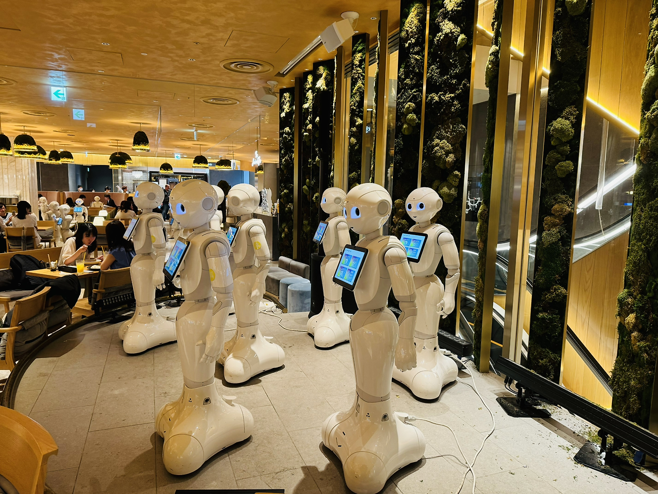 이곳에는 소프트뱅크가 만든 다양한 로봇들이 있습니다. Pepper는 입구에서 마중을 하고, 손님의 테이블에서 소통을 하는 로봇입니다. Servi는 배선 로봇으로 주문한 요리를 고객이 있는 자리까지 운반합니다. Whiz는 살균 청소 로봇으로 자율주행 기술을 활용하여 바닥을 청소합니다.