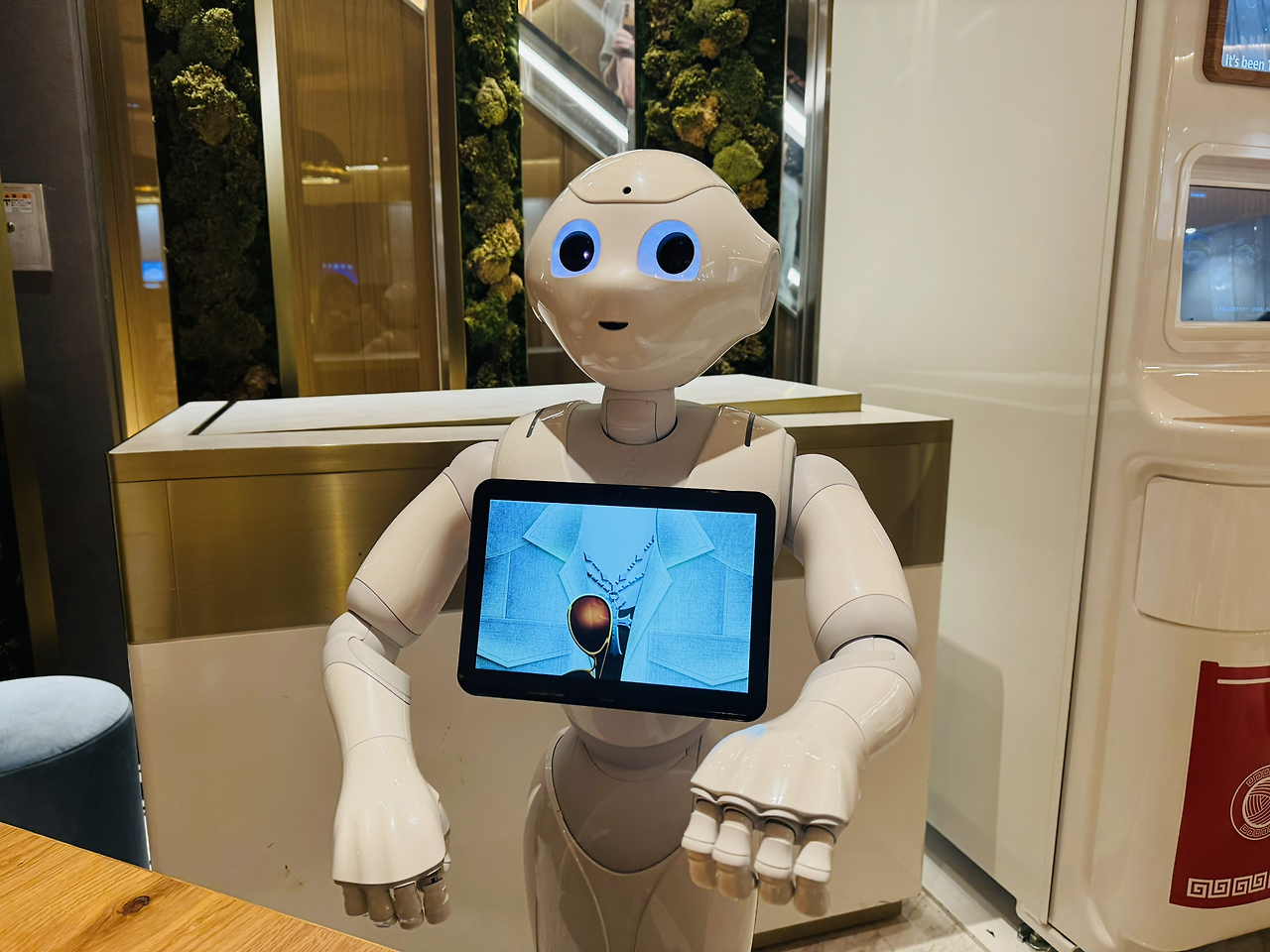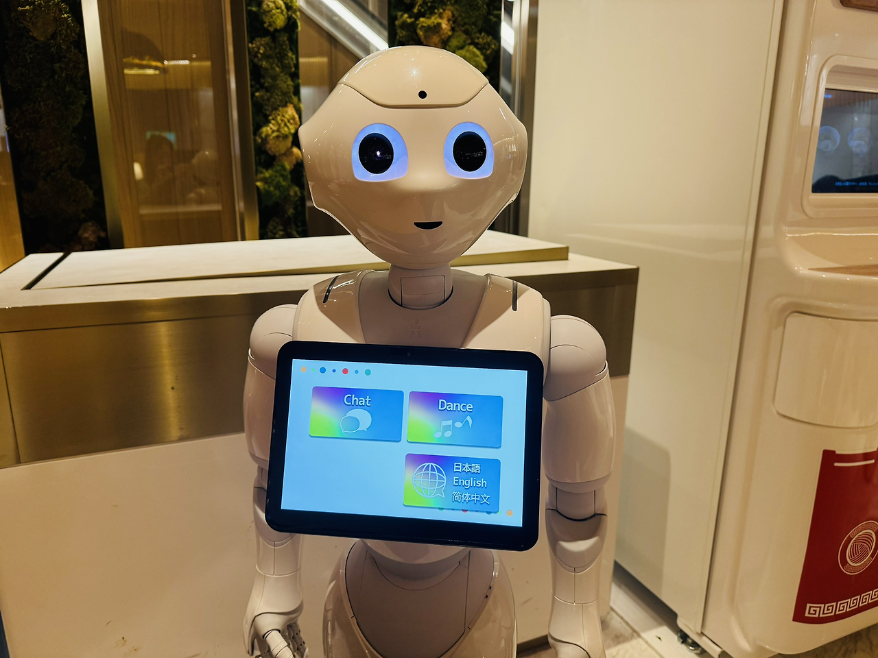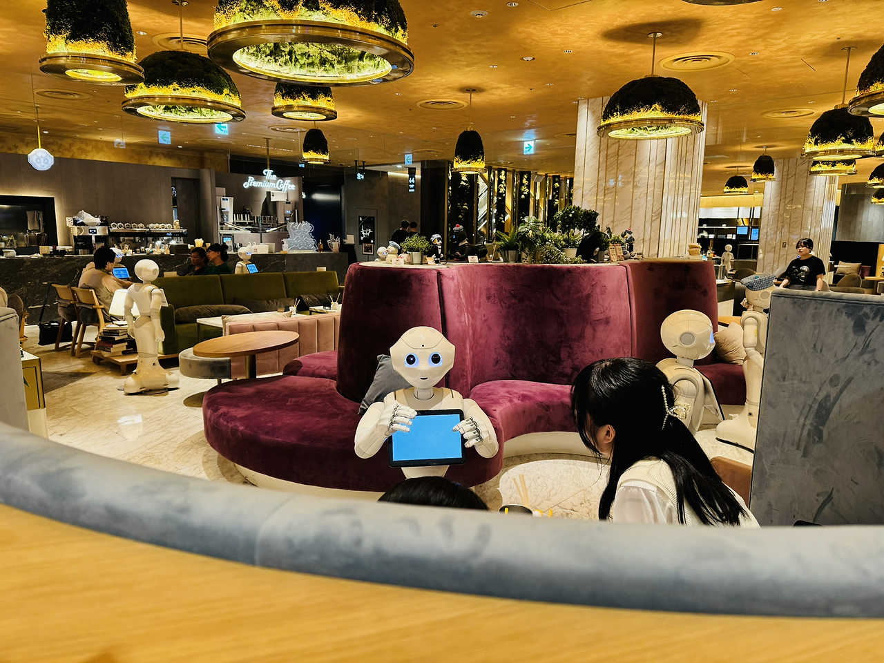 이곳에는 소프트뱅크가 만든 다양한 로봇들이 있습니다. Pepper는 입구에서 마중을 하고, 손님의 테이블에서 소통을 하는 로봇입니다. Servi는 배선 로봇으로 주문한 요리를 고객이 있는 자리까지 운반합니다. Whiz는 살균 청소 로봇으로 자율주행 기술을 활용하여 바닥을 청소합니다.