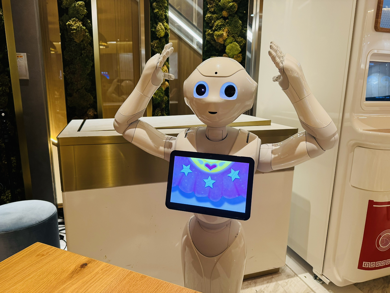 테이블마다 로봇 페퍼가 하나씩 배치됩니다. 페퍼는 손님과 대화를 하거나, 노래와 춤을 선보이거나, 게임을 주도합니다. 일본어, 영어, 중국어 메뉴가 있는데, 영어로 대화를 하기가 쉽지는 않았습니다. 내장된 카메라로 손님의 표정, 나이, 성별, 감정을 읽고 상황에 맞는 대사를 한다고 하는데 일본어를 하지 못해 충분히 즐기지 못해 아쉬웠습니다.