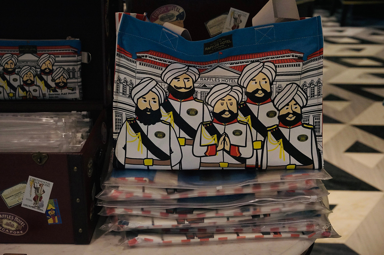 제복을 입은 도어맨도 래플스의 아이콘입니다. 도어맨은 래플스의 홍보대사 역할을 하는데, 깔끔한 흰색 터번과 흰 제복이 눈길을 사로잡습니다. 래플스에서 가장 사진이 많이 찍히는 직원이고, 호텔이 상을 받을 때면 전 세계를 여행하며 시상식에 직접 참여한다고 해요. 국가 원수나 고위 인사, 셀럽을 포함한 모든 게스트들을 가장 먼저 맞이하는 래플스의 얼굴입니다. 로비에 가면 사람들이 줄을 서서 도어맨과 사진을 찍고 있어요. 그 인기에 힘입어 라플스 부티크에서는 도어맨 굿즈도 판매하고 있답니다.