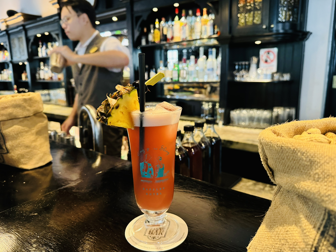 래플스 호텔 롱 바에서 25잔의 싱가포르 슬링이 주문될 때마다 칼리만탄 또는 수마트란 열대우림에 토종 수목 한 그루를 심는다고 해요. 싱가포르 슬링의 발상지에서 옛 전통을 느끼고 싶으신 분들은 래플스 호텔 2층의 롱 바에 가 보시는 것을 추천드려요!