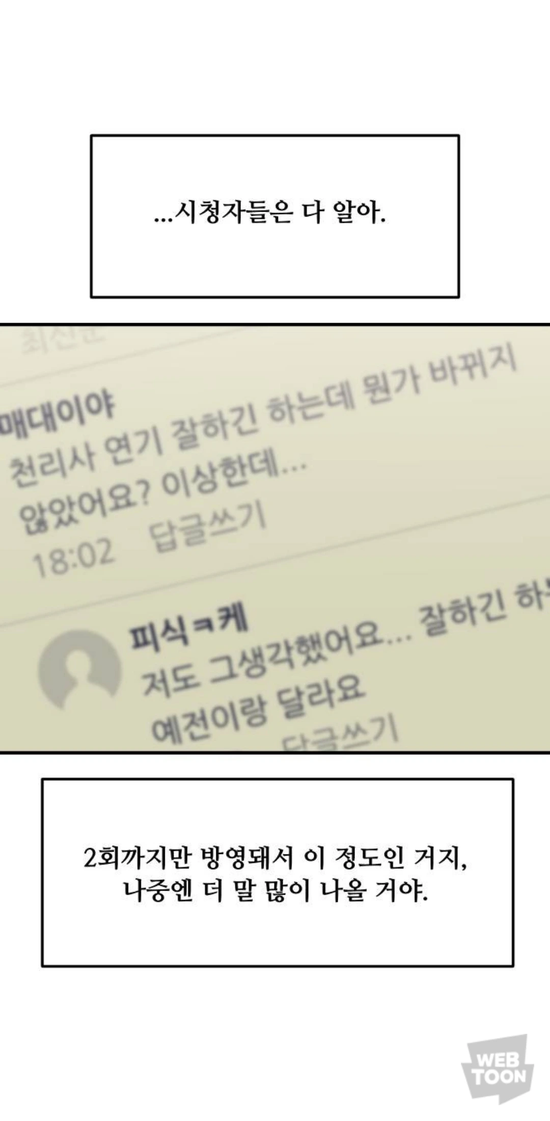 이 작품에서 나는 성장이라는 키워드 덕분에 스포츠물과 비슷한 희열을 느낄 수 있었다. 뻔하고 진부하게 느껴질 수 있는 연예계물에서 이렇게까지 자신의 인생을 꿋꿋하게 살아가는 캐릭터를 만난 적이 있었나? 단 한번도 없었다. 천리사는 이전에 없던 캐릭터인 건 확실하다. 그럼에도 우리와 가장 맞닿아있는 캐릭터이다.