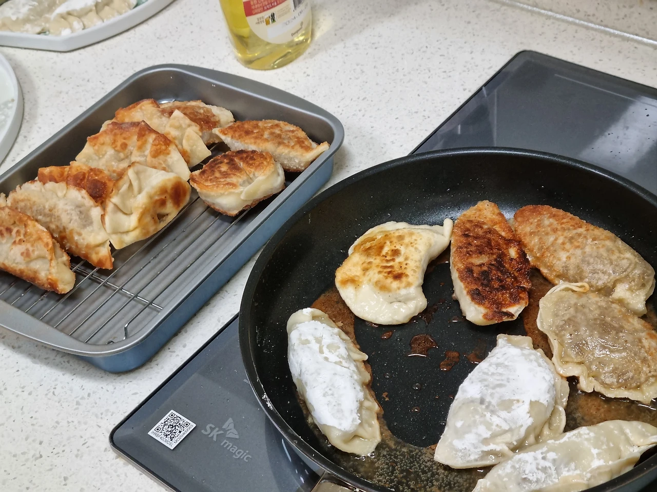 일본에서 자주 교자를 구워 먹었던 난 당당하게 만두 굽는 건 나에게 맡기라고 했다. 사실 특별한 비법이 있는 건 아니었다. 기름을 넉넉하게 두르고 타지 않게 열심히 뒤집어주면 되는 일이었다. 하지만 딸이 영 믿음직스럽지 못한 탓인지 엄마아빠는 옆에서 꿋꿋하게 잔소리를 했다. 하필 조금 태워먹는 바람에 한소리 더 들었지만 그걸 빼면 꽤 괜찮은 모양새로 구웠다.