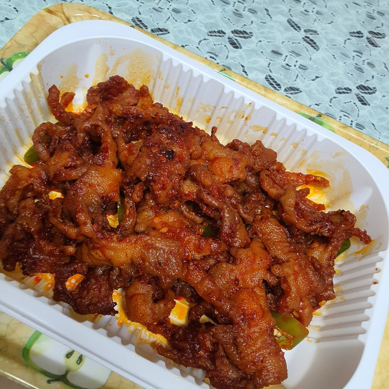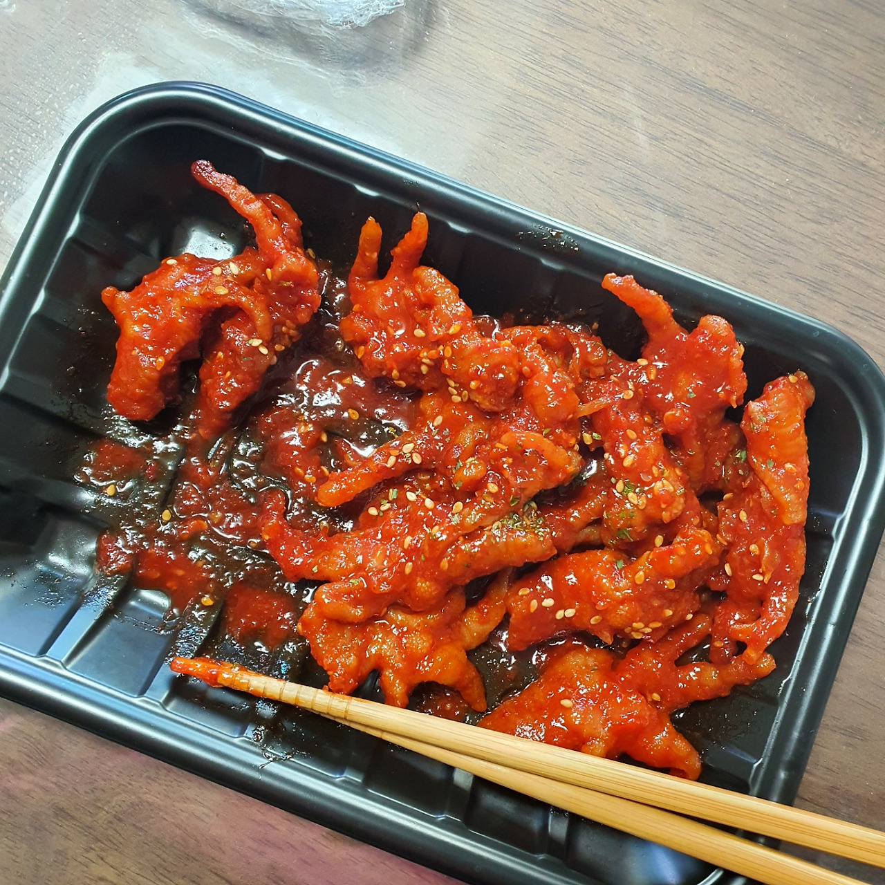 다음으로 닭발이 생각난 건 한참 뒤였는데, 닭발이 그리웠기보다는 적절한 매운맛을 못 찾았기 때문이었다. 친구가 다음에 먹을 때는 꼭 무뼈 닭발을 먹으라는 게 생각이 났다. 어디서 시켜야 하나 고민을 하던 찰나에 자주 먹던 치킨집에서 무뼈 닭발을 파는 것을 발견했다. 두근거리는 마음으로 닭발을 주문했고 결과적으로는 대만족이었다.