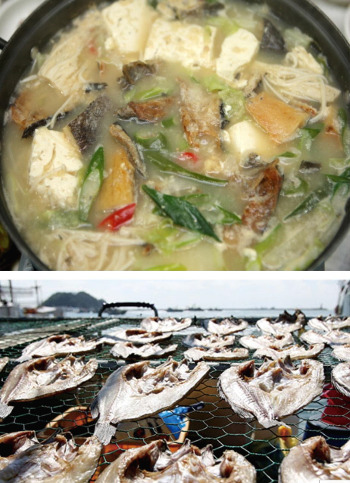 포(鮑)를 떠서 소금 간한 우럭 살을 햇볕에 말렸다가 쌀뜨물에 우럭포, 무, 액젓, 대파, 다진 마늘, 미나리를 넣어 끓인 찌개로 뽀얀 국물에서 우러나오는 진하고 담백한 맛이 천하일품이다.