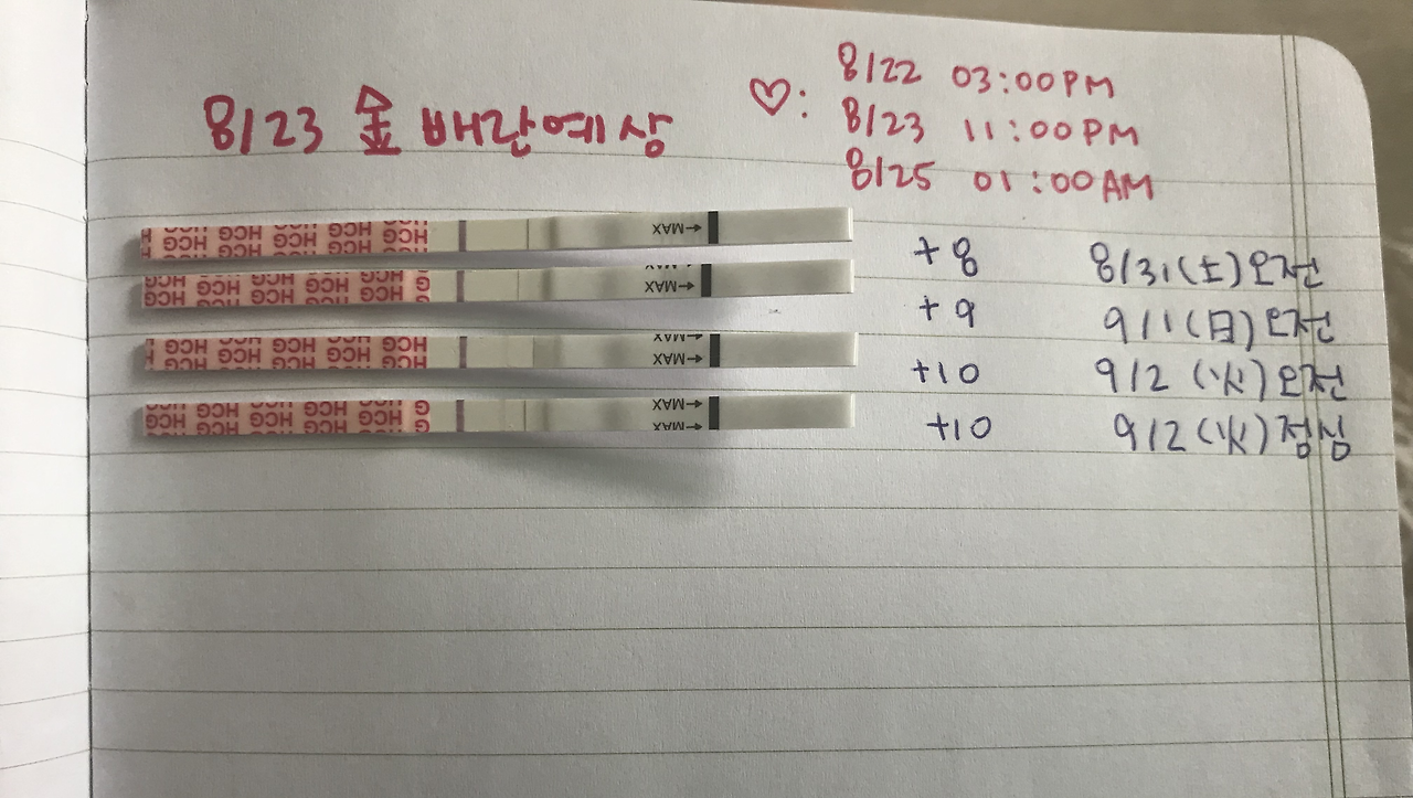 전혀 기대하진 않았다곤 해도.. 한편으론 날짜를 세고 있었다. 휴직 중이라 좀 할 일이 없기도 했고(...) 혹시나 몰라서 7일 차부터 원포를 하나씩 까고 있었는데, 9일 차에 의외로 두 줄이 나와서 깜짝 놀랐다. 오후에 해보니 좀 더 진해져 있어서 헉, 설마 진짜로? 하는 마음에 두근거리기 시작했다.