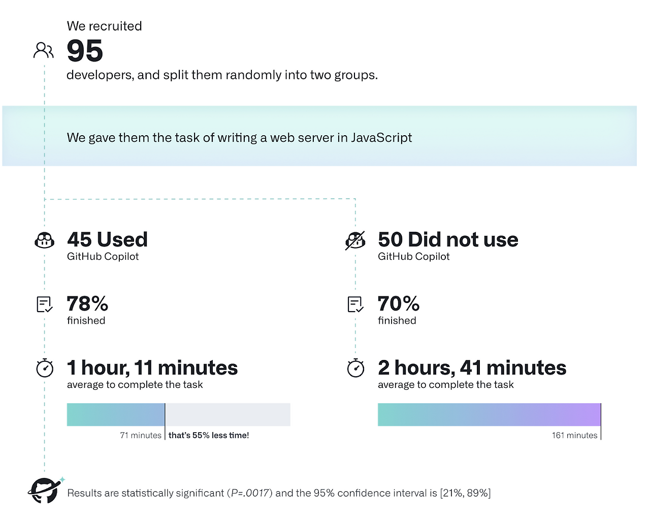 - 개발 속도도 2시간 41분 소요되던 시간이 1시간 11분으로 55% 더 빠르게 과제를 수행했습니다. 특히 반복적인 작업을 할 때 더 빨리 완료된다고 보고됐습니다.