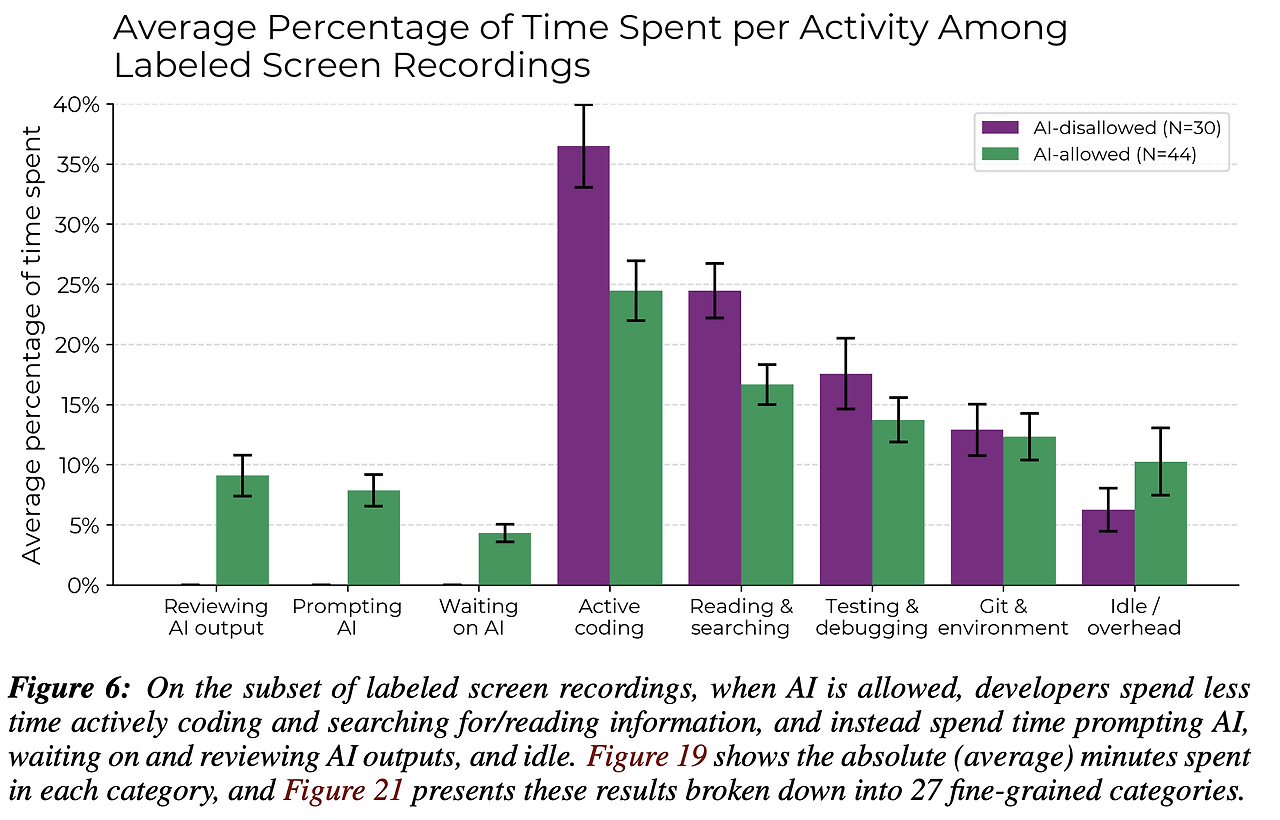 숙련된 개발자는 작업 전반에 걸쳐 작업 속도가 AI 사용 그룹에서 저하되는 현상이 발생되었으며 그 원인은 다음과 같습니다.