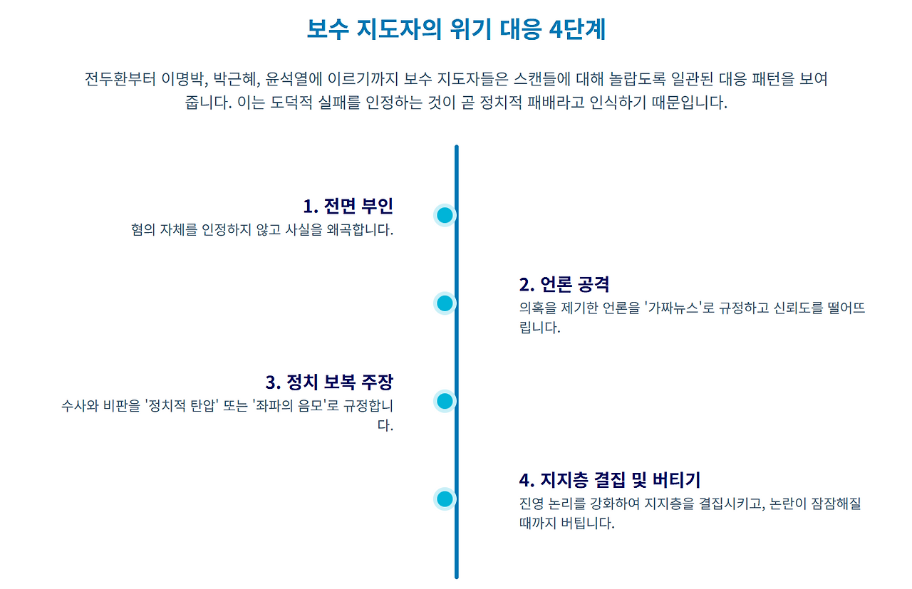 이러한 역사적 배경은 보수 지도자들에게 놀라운 ‘회복탄력성’을 부여한다. 그들은 스캔들 앞에서 좀처럼 수치심을 드러내거나 책임을 인정하지 않는다. 전두환의 "전 재산 29만 원" 발언, 이명박, 박근혜 전 대통령의 ‘정치 보복’ 프레임, 그리고 윤석열 정부의 ‘가짜뉴스’ 공세에 이르기까지, 그들의 전략은 일관되게 ‘버티기’와 ‘반격’이다. 잘못을 인정하는 것은 곧 나약함을 보이는 것이며, 적에게 영토를 내주는 패배로 간주된다.