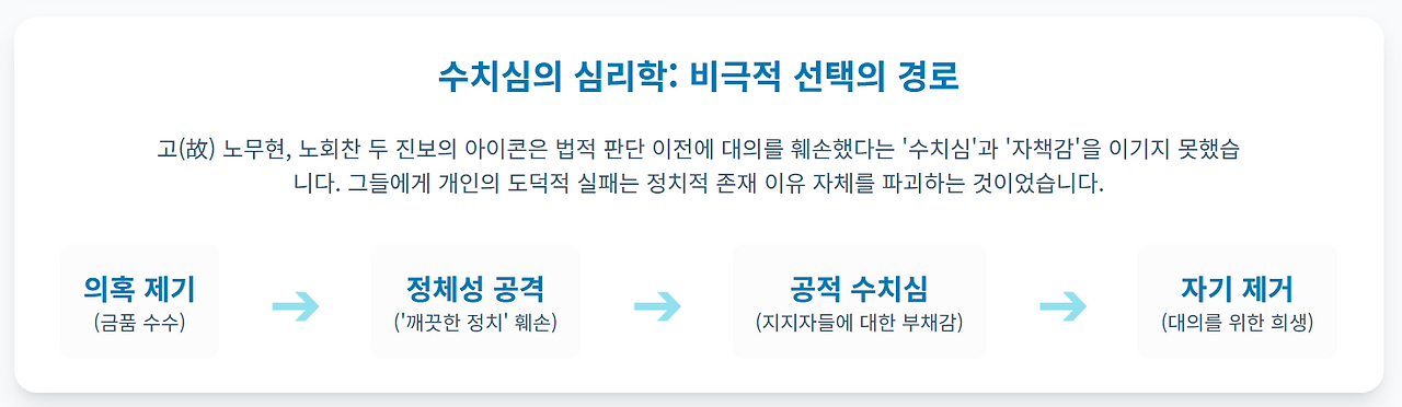 故 노무현 전 대통령의 비극은 이 구조의 정점을 보여준다. 가난을 딛고 기득권에 맞선 ‘깨끗한 정치인’이라는 그의 정체성은, 가족이 돈을 받았다는 의혹 앞에 속절없이 무너져 내렸다. “나로 말미암아 여러 사람이 받은 고통이 너무 크다”는 그의 마지막 말은, 법적 처벌의 두려움을 넘어 자신이 쌓아 올린 도덕적 세계가 파괴되는 데서 오는 깊은 수치심의 발로였다.