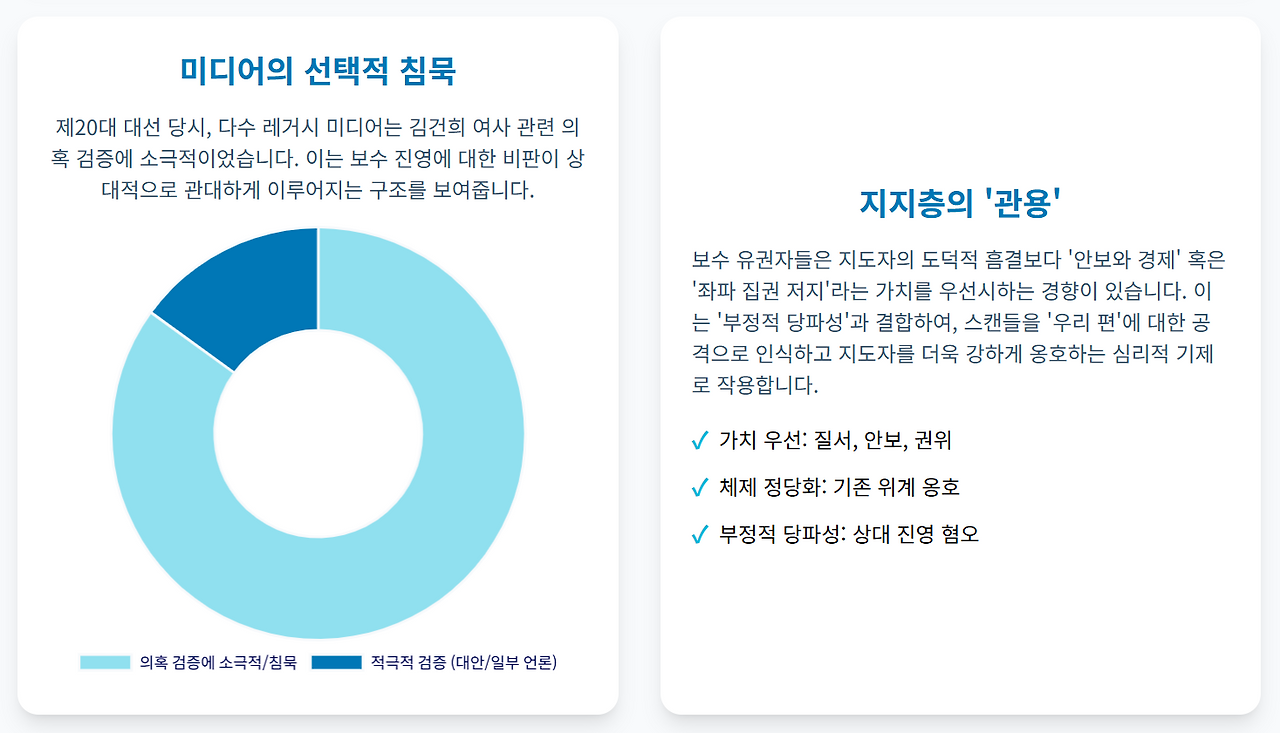 제20대 대선은 이 모든 역학을 압축적으로 보여주었다. 윤석열 후보와 배우자 김건희, 장모 최은순 등 그 가족을 둘러싼 수많은 의혹에도 불구하고 그는 승리했다. 많은 유권자는 그의 도덕성 문제에 ‘그 정도는 괜찮다’고 판단했거나, 정권 교체라는 더 큰 대의를 우선시했다. 이는 보수 유권자들이 비합리적이어서가 아니라, 그들의 가치 체계 속에서 질서, 힘, 그리고 이념적 승리가 개인의 도덕적 순수성보다 우선하기 때문이다.