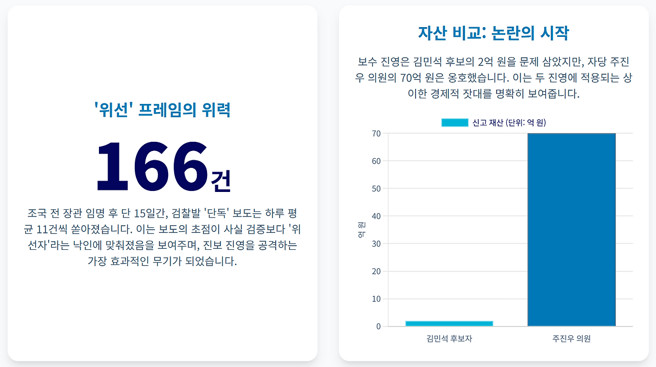 이처럼 진보에게 도덕성은 지켜야 할 가치인 동시에, 상대를 공격하는 가장 날카로운 무기가 된다. ‘조국 사태’에서 ‘내로남불’이라는 프레임이 그토록 강력했던 이유는, 공격의 핵심이 부패 그 자체가 아니라 ‘위선’이었기 때문이다. 이상을 기반으로 세워진 정치 운동에 위선이라는 혐의는 그 어떤 공격보다 치명적이다. 언론은 검찰이 던지는 정보를 받아쓰며 그를 ‘위선자’로 낙인찍었고, 그 보도의 양과 집요함은 보수 진영 인사를 둘러싼 의혹과는 현저한 차이를 보였다.