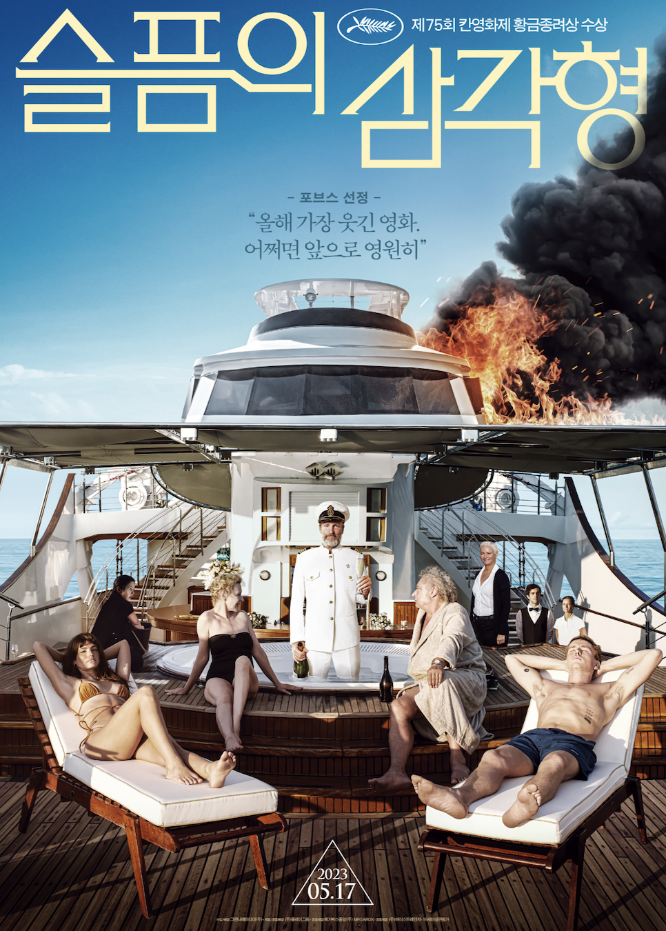호화요트에 모인 전 세계 부자들. 망망대해에 둥둥 떠 있는 배 안에 계급주의, 인종주의, 사회주의, 자본주의가 뒤섞여 있다. 잘 나가는 여자친구 덕에 공짜 이벤트로 배에 올라 권력을 맛본 남자는 ‘칼’은 인물 자체가 영화를 관통하는 메시지다. 배가 침몰하고 있는 마당에 미국인 선장은 마르크스를, 러시아 사업가는 롤렉스를 이야기한다. 풍자와 해학, 혐오와 허무, 염세주의로 똘똘 뭉친 그들의 존재를 영화는 시원하게 토사물과 똥으로 표현한다. 은유나 반어법 대신 직설적인 펀치다. 내가 이 영화를 영화관에서 큰 스크린으로 봤다면 어땠을까, 분명 비위 상해 자리를 뜨는 사람도 몇몇 있었겠지.