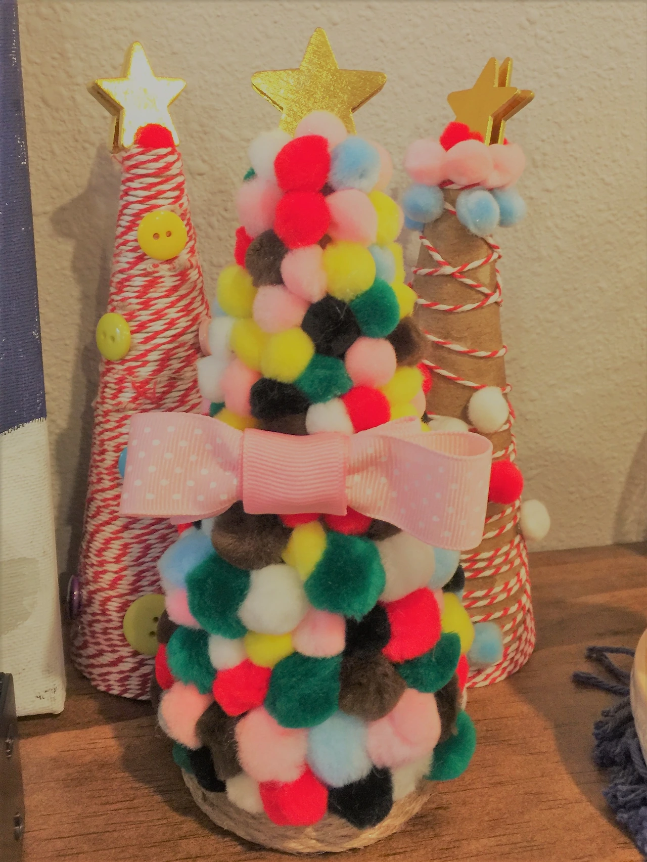 집에 돌아온 아이들이 나의 혼자 놀기 흔적을 보고 달려들어 함께 만든 소품. 이제 만 4살 된 막내는 색색의 폼폼만 붙이면 되는 간단한 소품을 만들었다. 물론, 뜨거운 글루건을 알맞은 양으로 쏘아주는 것은 엄마의 몫. 6살이 다 된 둘째 아이는 나름의 창작 의도가 있어서 면실로 듬성듬성 두른 다음 정확히 계산된 양의 폼폼만 붙이는 것으로 마무리했다. 마지막 남은 틀은 엄마가 면실 감아, 뒹구는 단추로 데코. 별을 꼭 달아야 한다는 딸내미들의 성화에 마무리는 별 장식으로.