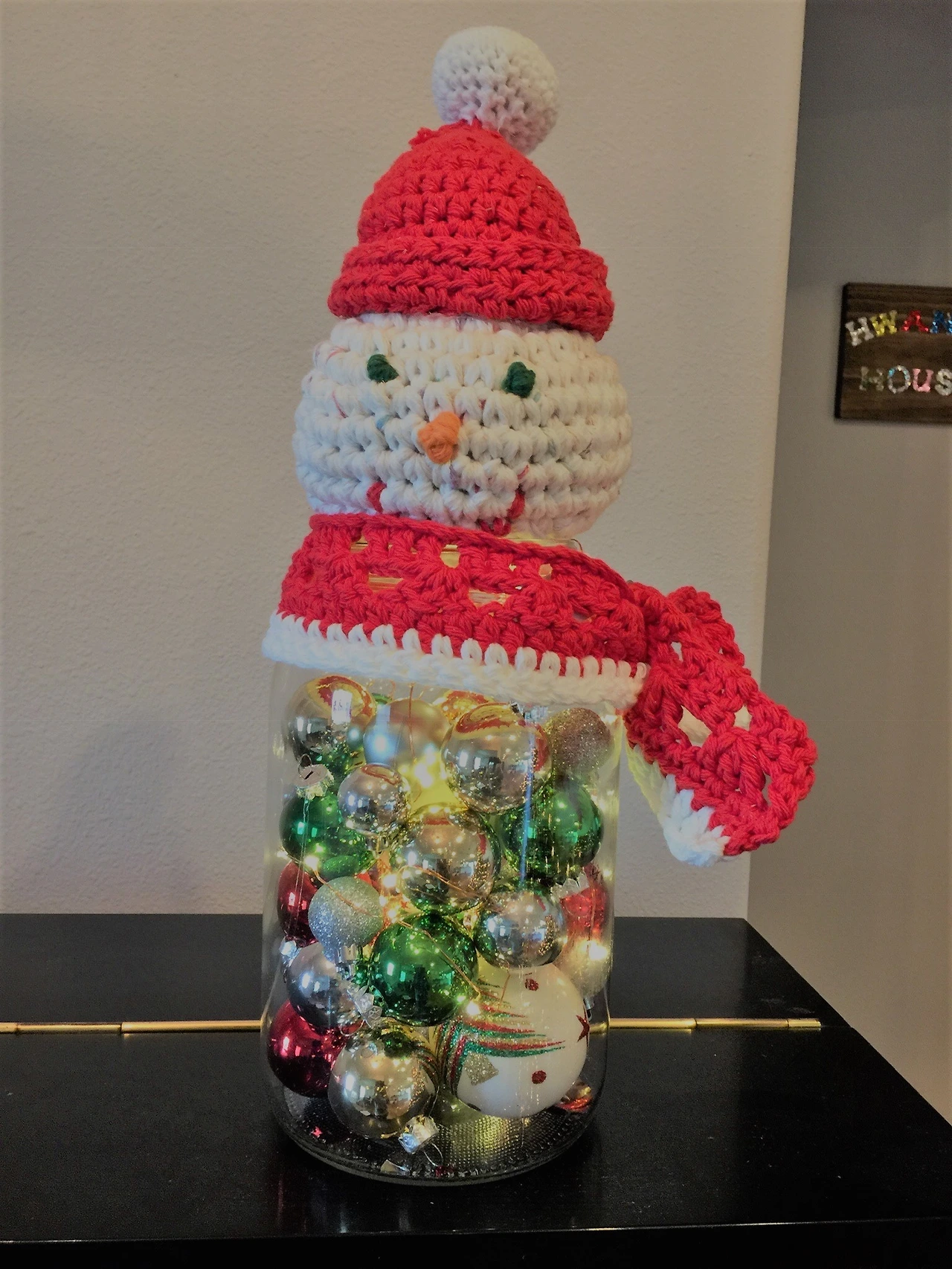 큰 유리병에 오너먼트와 전구를 넣어 현관문 앞에서 반짝이게 하고 싶었다. 알아보니 만들어진 제품은 너무도 가격이 사악했다. 그래서 만들기로 했다. 그런데, 맙소사. 유리병 가격도 만만치가 않다. 고민 끝에 다 먹은 김치통을 활용하기로 했다. 튼튼한 유리이니까 더할 나위 없이 좋은 재활용이었다. 상표를 떼고 깨끗이 씻어 말렸다. 코바늘로 눈사람 얼굴을 만들어 솜을 채워 넣고 눈, 코, 입을 만들어준다. 모자도 만들어 붙여주고, 병 입구와 눈사람 머리 사이의 공간을 가리기 위해 목도리도 떠서 올려준다. 병 안에 색색의 오너먼트를 채워가며 전구를 넣어준다. 작년에 밖에 내놨더니 전구가 너무 금방 망가져 버려서 올해는 집 안에 들여놓기로 한다.