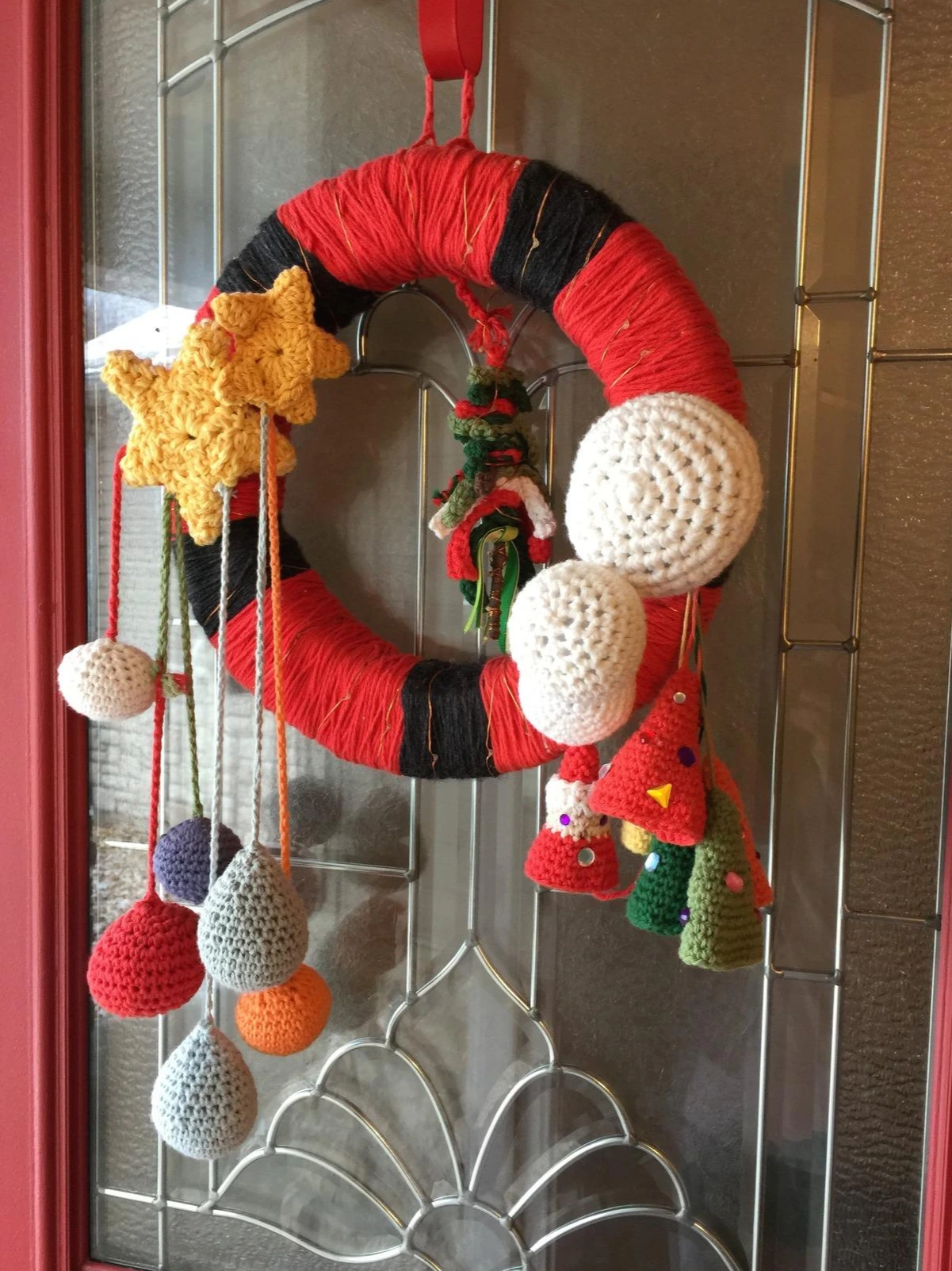 집에 굴러다니는 스티로폼 원형 틀이 있어서 재활용했는데, 거기에 실을 감는 것이 보통 일이 아니었다. 스티로폼이 온 집안에 날리고, 얇은 실을 이용했더니 감아도 감아도 끝이 날 것 같지 않았다. 어쨌든 포기하지 않고 보란 듯이 검은색과 빨간색 실로 첫 단계를 마무리했다. 방울 모양, 원통 모양, 고깔 모양, 별 모양을 코바늘 뜨기로 만든다. 한두 개 만들고 색을 맞춰가며 중간중간 크기 조절도 한다. 위치를 잡아주고 글루건으로 붙이는 작업까지 완료한다. 코바늘로 긴뜨기를 여러 개 해 둔다. 각각 길이가 다른 긴뜨기를 하는 것이 포인트이다. 뒷마당에 굴러다니는 마른 나뭇가지 하나를 주워와 그 위에 긴뜨기 한 직물을 묶어준다. 위에서부터 아래 방향으로, 짧은 것부터 긴 것의 순서로 묶어주면 삼각형 모양의 트리가 만들어진다. 트리 모양의 나뭇가지를 가운데 달아주면 마침내 리스가 완성된다.