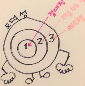 난나 씨는 종이 위에 그림을 그렸어. 3개의 동심원을 그렸지. 가장 안쪽이 범주 1, 절대적 도덕성. 두 번째 동심원이 범주 2, ‘그럴 수도 있구나’의 상대적 도덕성. 가장 바깥 동심원이 범주 3, ‘감옥에 가겠군’의 도덕성.