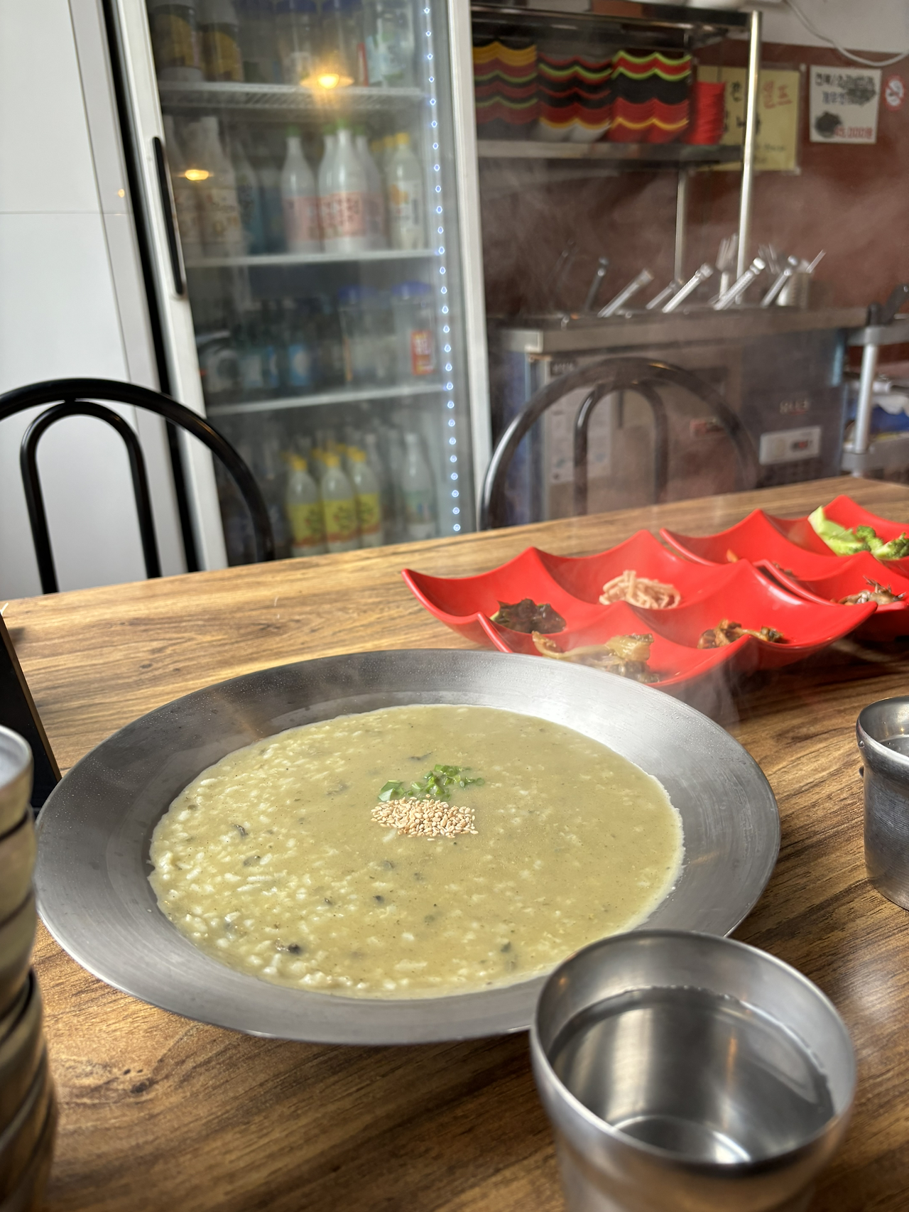 하선하니 비가 왔어요. 일단 사람이 들끓기 전에 보말죽을 먹고 트래킹을 시작해야겠다고 생각했습니다. 보말죽을 파는 여러 식당들이 있었지만 저는 눈앞에 보이는 곳으로 들어갔습니다. 너무 춥고 감기기운이 올라와 더 이상 움직일 힘이 없었기 때문입니다. 식당엔 저 말고 아무도 없었습니다. 보말죽을 주문하고 앉아 있다가 따뜻한 물을 컵에 담았는데 스댕 컵이 뜨거워져서 손을 델 뻔했습니다. 보말죽은 고소하고 따뜻하고 맛있었습니다. 공깃밥 1.5개 정도가 들어갔을까? 생각했어요. 계산을 하고 나가는 길에 사장님께 왼쪽으로 걸을지, 오른쪽으로 걸을지 여쭤봤습니다. 바람 때문에 오늘은 왼쪽으로 도는 게 낫다고 말씀해 주셔서 좋은 정보를 얻었다고 생각하며 문을 열었습니다. 사장님은 짐을 두고 가도 된다고 말씀해 주셨지만 저는 [혹시몰라병]이 있기 때문에 그냥 무겁게 걷기로 결심합니다.