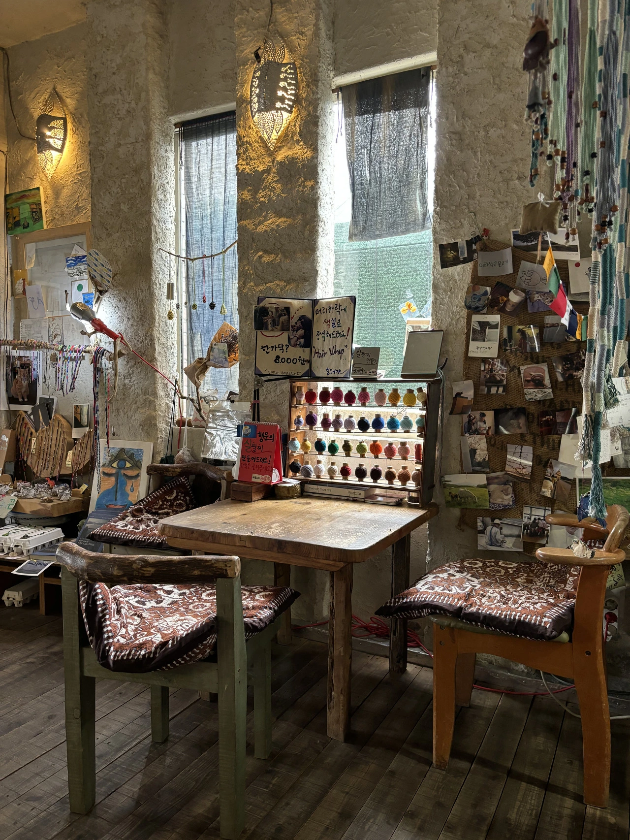 보헤미안. 보헤미안. 에스닉한 내부와 고양이 한 마리가 저를 반겼습니다. 짐을 내려놓고 메뉴판을 받았습니다. 따뜻한 짜이와 호떡을 주문했습니다. 짜이 냄새와 달달한 냄새가 곧 내부를 감싸기 시작했습니다. 팔찌 제작을 하시는 걸 알고는 있었지만 실제로 보니 더 그 공간이 참 예뻤습니다. 여러 색의 실들이 나무 선반에 꽂혀 있습니다.
