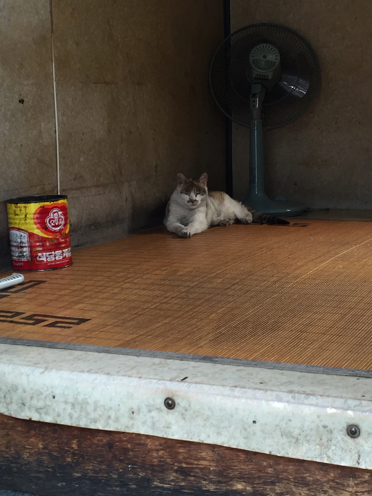 그러던 어느날, 내가 사는 건물 1층 바로 코앞에 택시아저씨들이 밥먹고 잠시 쉬어가는' 00시 택시 휴게소' 간판을 단 컨테이너가 한 동이 있는걸 알게 되었다. 열댓명되는 아저씨들이 노상 바둑을 두거나, 낮잠을 자거나, 커피 한잔을 하는 사랑방역할을 하는 이곳에 정말 쌩뚱맞게 삼색고양이 한마리가 자리를 잡고 있었던게 아닌가. 그냥 지나가는 길이려니 했다. 하지만 다음날도 그 다음날도 그 녀석은 컨테이너 안에서 늘어지게 자거나 또 자거나 가끔 기지개를 피거나 하는 등 이곳에서 하루이틀 숙박을 한 모양새가 아니었다. 그리고 내 눈에 띈 컨테이너 안에 가지런하게 놓여진 사료와 물그릇, 고양이 화장실까지...아....나는 작은 탄식을 내뱉고야말았다.