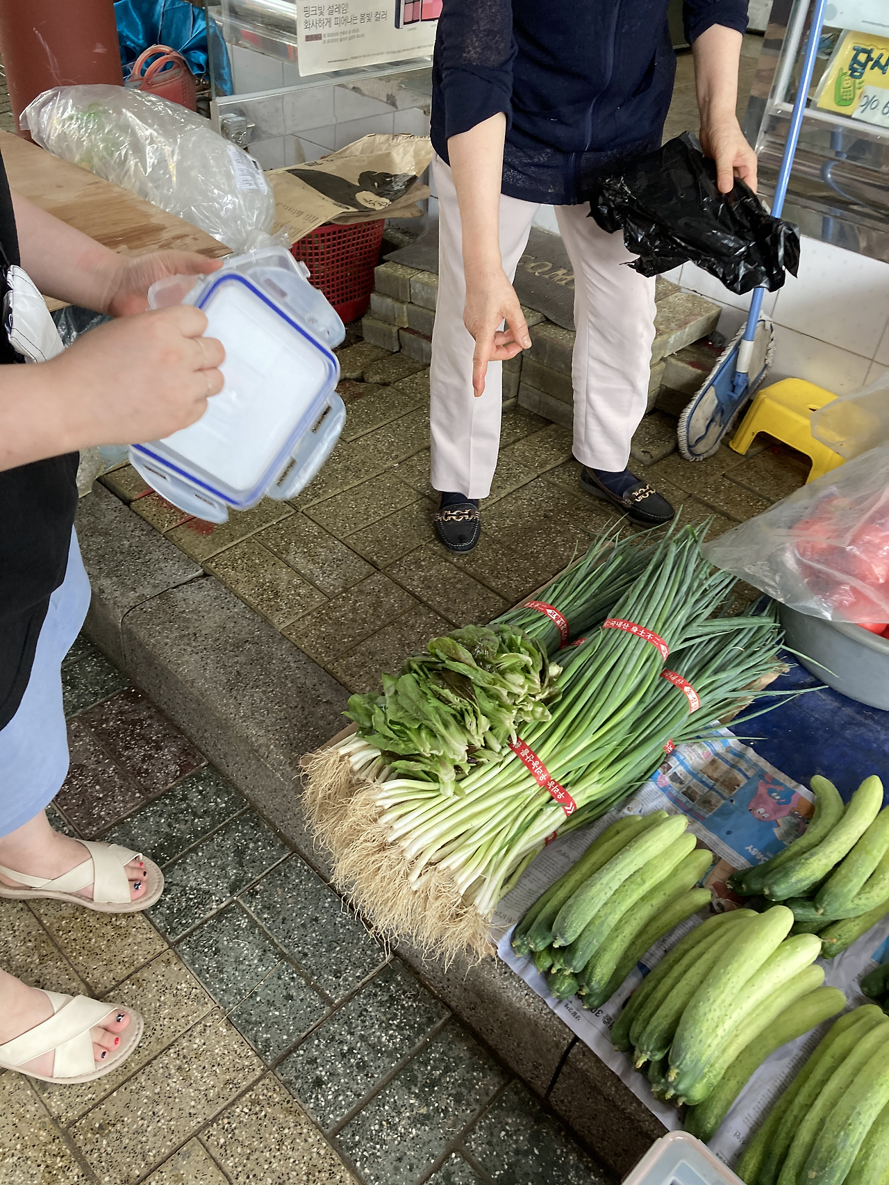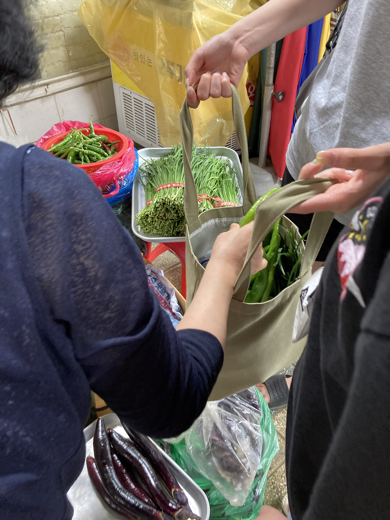 정육점의 승리 덕분에 한결 가벼운 마음으로 다음 관문인 야채가게로 향했다. 그러나 버선발로 나오시며 검은 비닐봉지부터 뜯어오시는 사장님. 우리가 만류하기도 전에 날쌘 손놀림으로 비닐을 열어젖히셔서 죄송한 마음까지 들었지만, 여기 담아 달라고 에코백을 내밀었다.