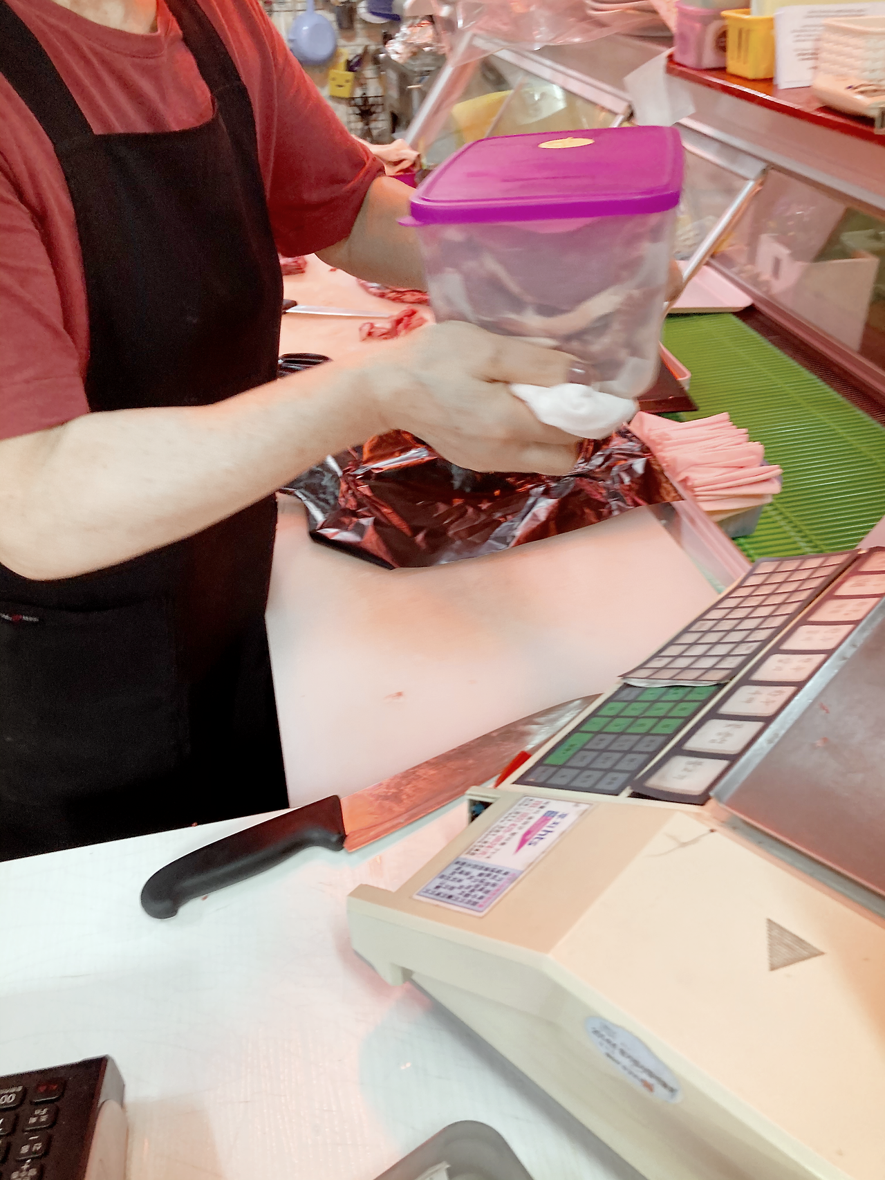꼬리에 꼬리를 무는 개꿈을 깨뜨리는 건 역시 현실. 정육점에 들어서니 어떻게 말을 꺼내나 입술이 떨어지질 않는다. 앞사람이 산 소고기를 스티로폼 그릇과 랩으로 순식간에 포장하시는 사장님 앞에서, 그래도 우리는 용기를 내 보았다.