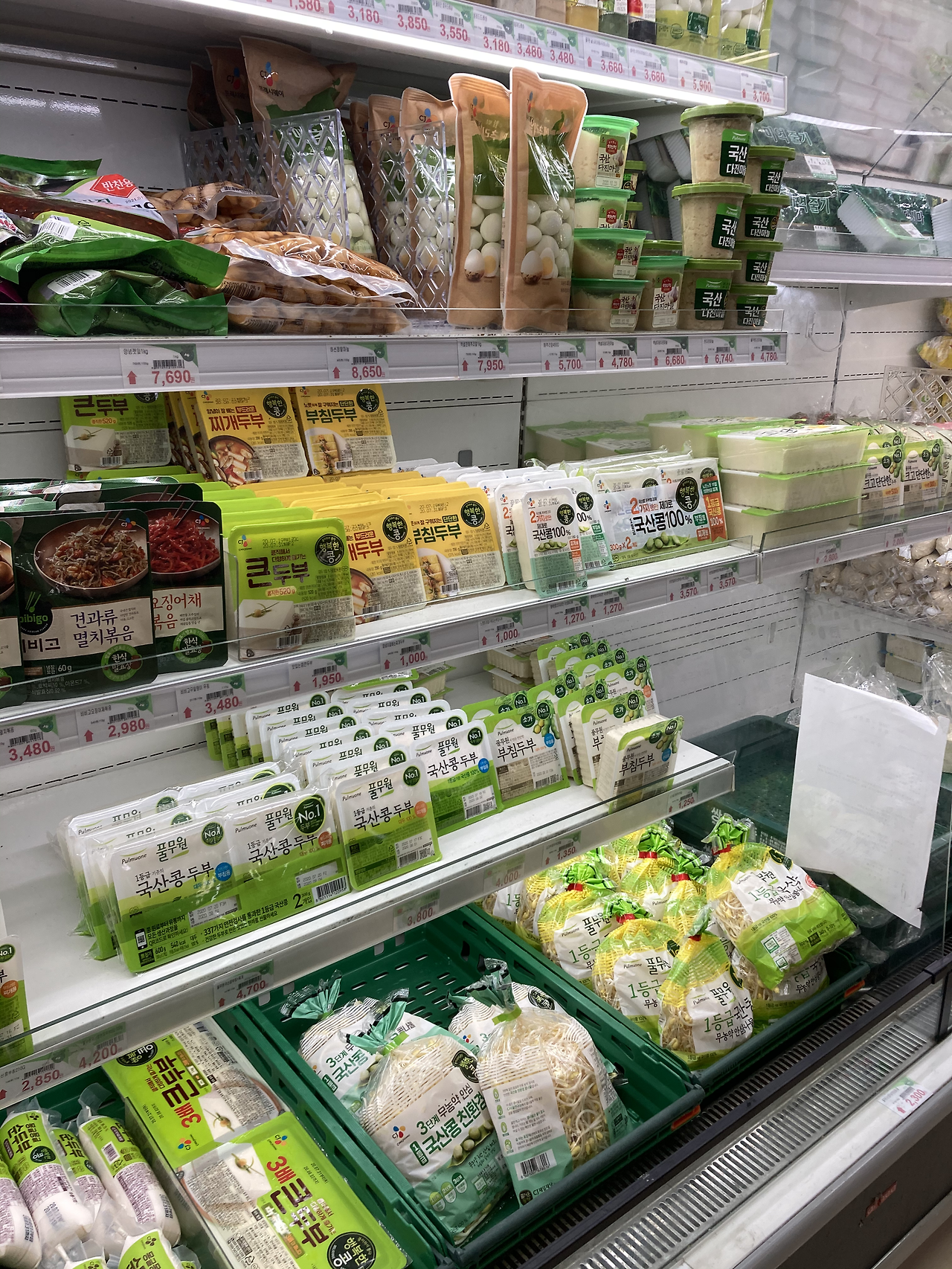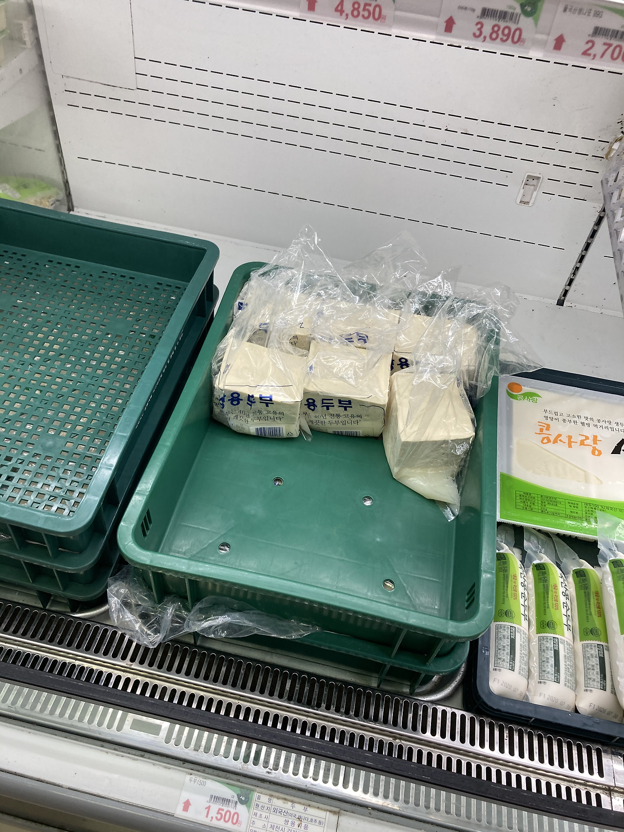 마지막으로 혹시나 하는 마음으로 마트에 들렀다. 역시나 포장을 두세겹씩 입고 있는 두부진열대를 보고 포기하려던 순간, 정겨운 비주얼의 판두부가 드디어 모습을 드러냈다. 오예 하나로마트 만세~ 국산 식재료 만세~ 비닐포장을 한 겹 입고 있었지만 두부의 물기 때문에 그 정도는 타협하기로 했다. 감자떡도 잃었는데 두부 못 잃어. 적어도 주어진 선택지 중에선 가장 제로웨이스트에 가까운 형태였다고 스스로를 다독였다.