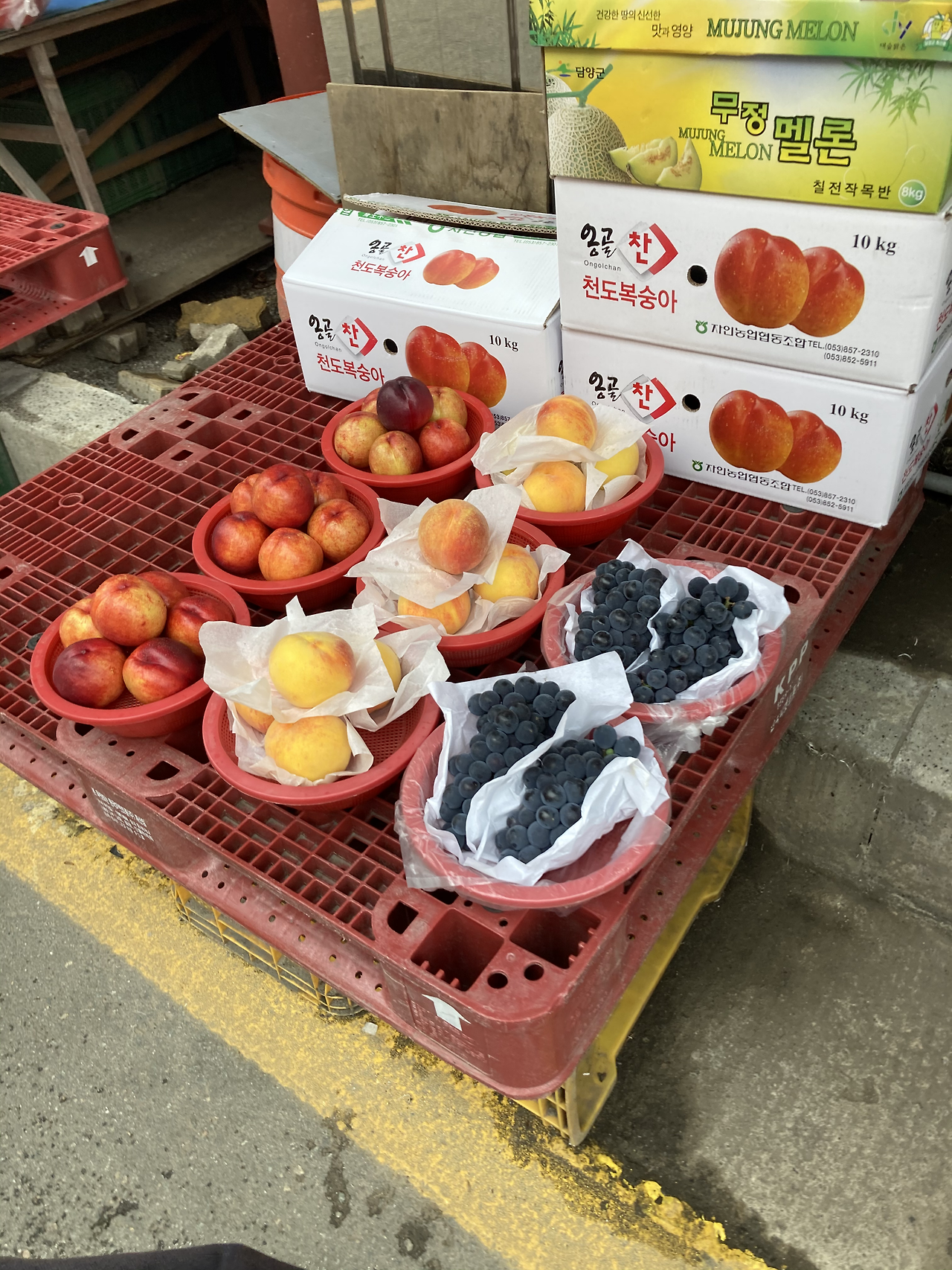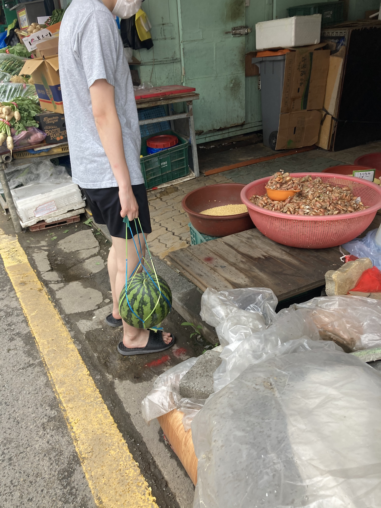마지막으로 과일을 고르는 과정은 수월했다. 포장이 최대한 덜 된 것을 고르려니 하나하나 예쁘게 포장된 녀석들은 아웃. 포장을 신경 쓰며 장을 보려니 과일들이 정말 '하나하나' 포장되어 있다는 게 새삼스레 눈에 들어왔다. 결국 포장이 없는 수박과 복숭아를 들고 장보기를 마무리했다. 비닐포장된 채소와 과일은 생물 보다는 공장에서 나온 제품 같은 묘한 이질감을 주었다. 언제부터 우리가 이렇게 매끈한 포장을 미덕으로 여기게 된 걸까?